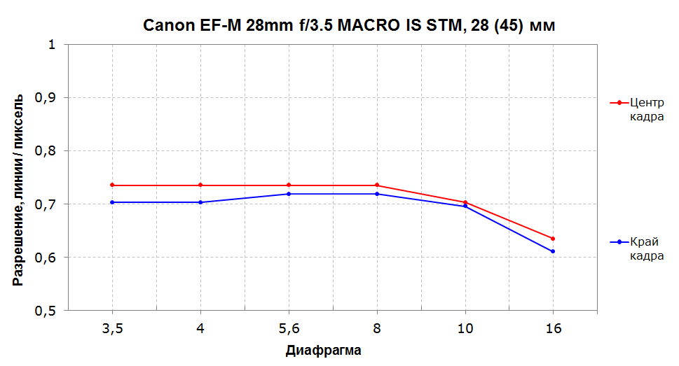 Canon EF-M 28mm f/3.5 Macro IS STM особенно хорошо чувствует себя на открытых диафрагмах, показывая высокую разрешающую способность как в центре, так и на краях изображения. Но после f/8 ситуация меняется, когда в силу вступает эффект дифракции, что несколько обидно, ведь как раз в макрофотографии закрытая диафрагма востребована как нигде.