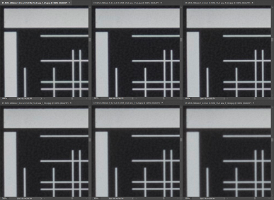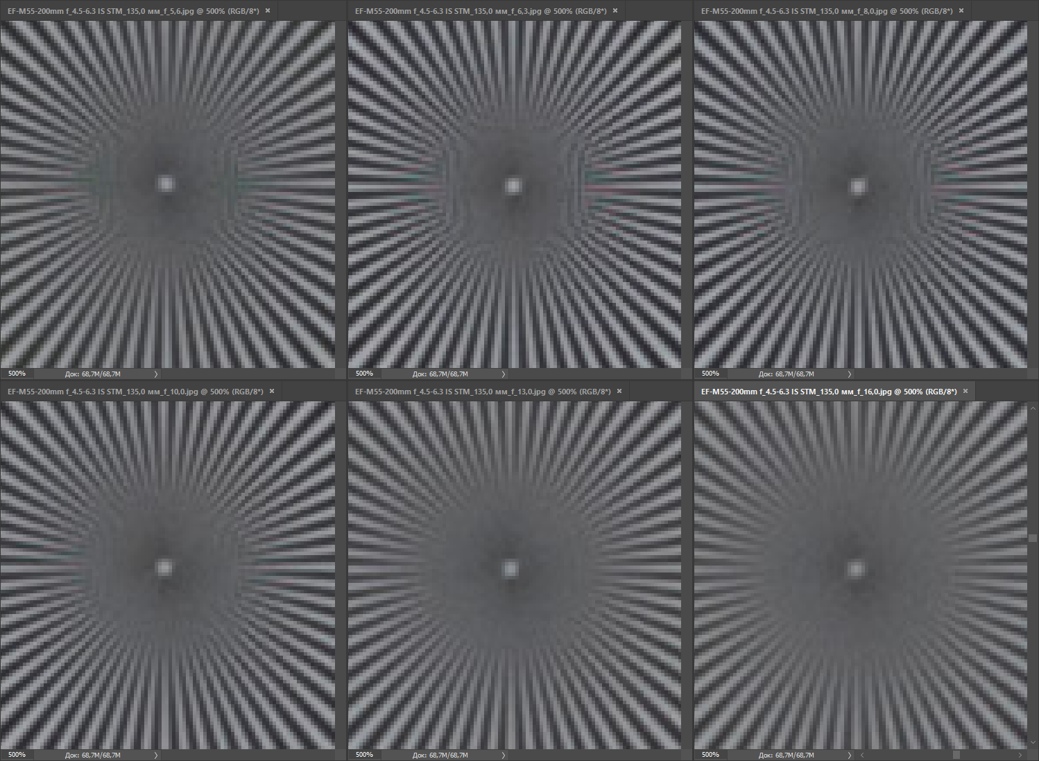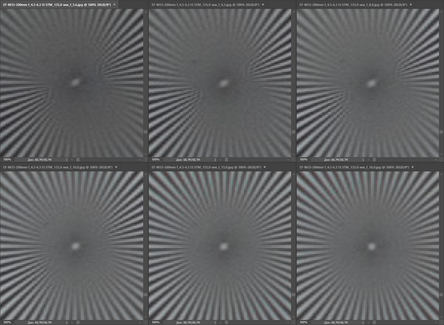 | на всех скриншотах верхний ряд: f/6,3 — f/7,1 — f/8, нижний ряд: f/10 — f/13 — f/16 | |