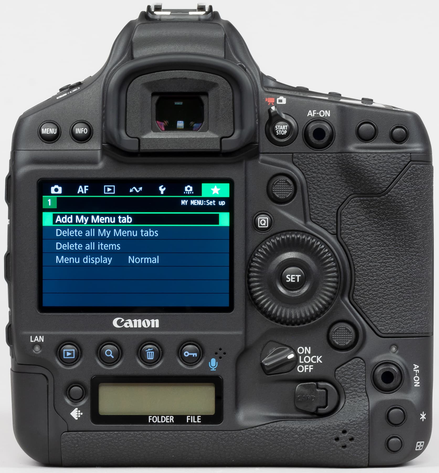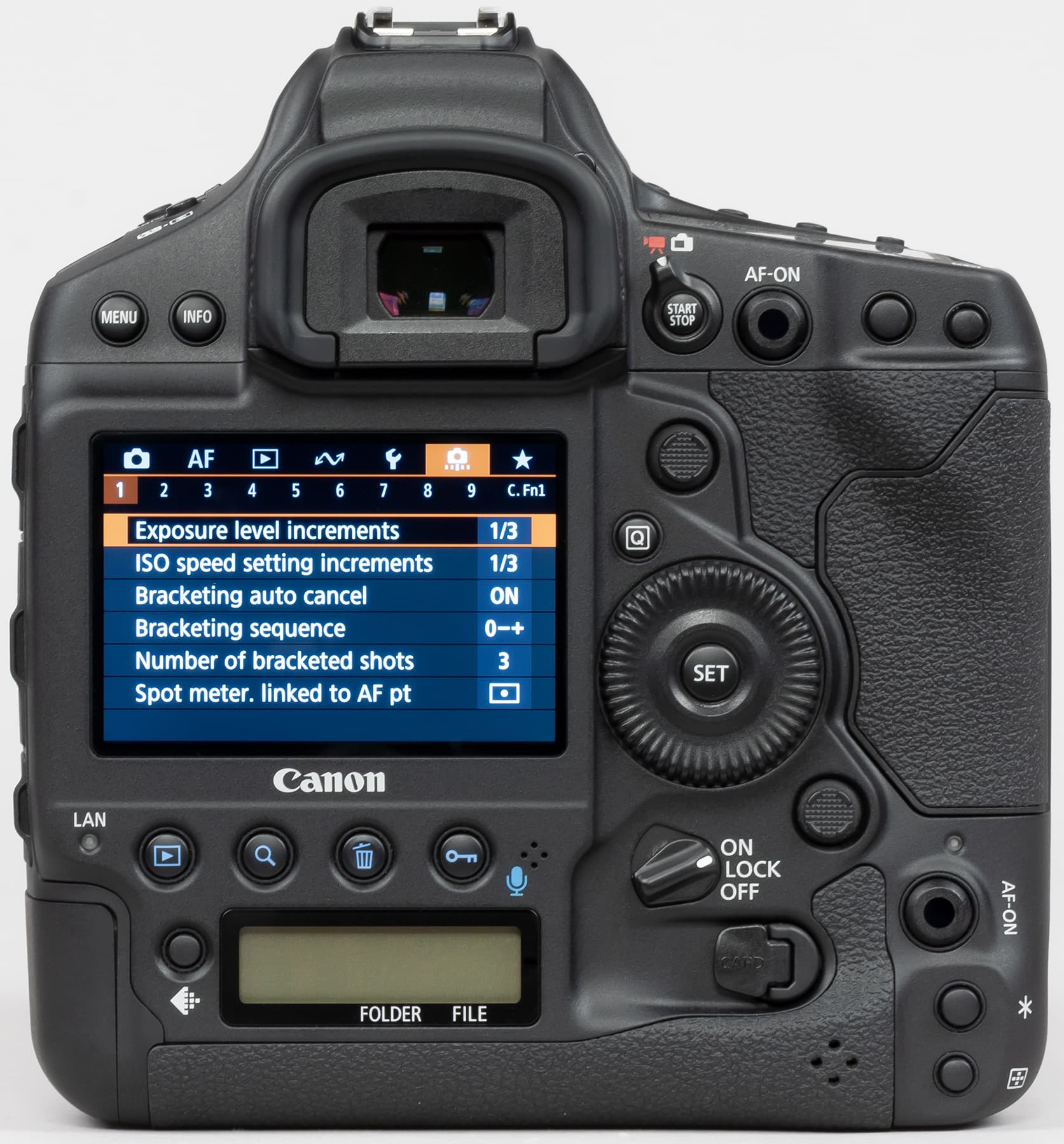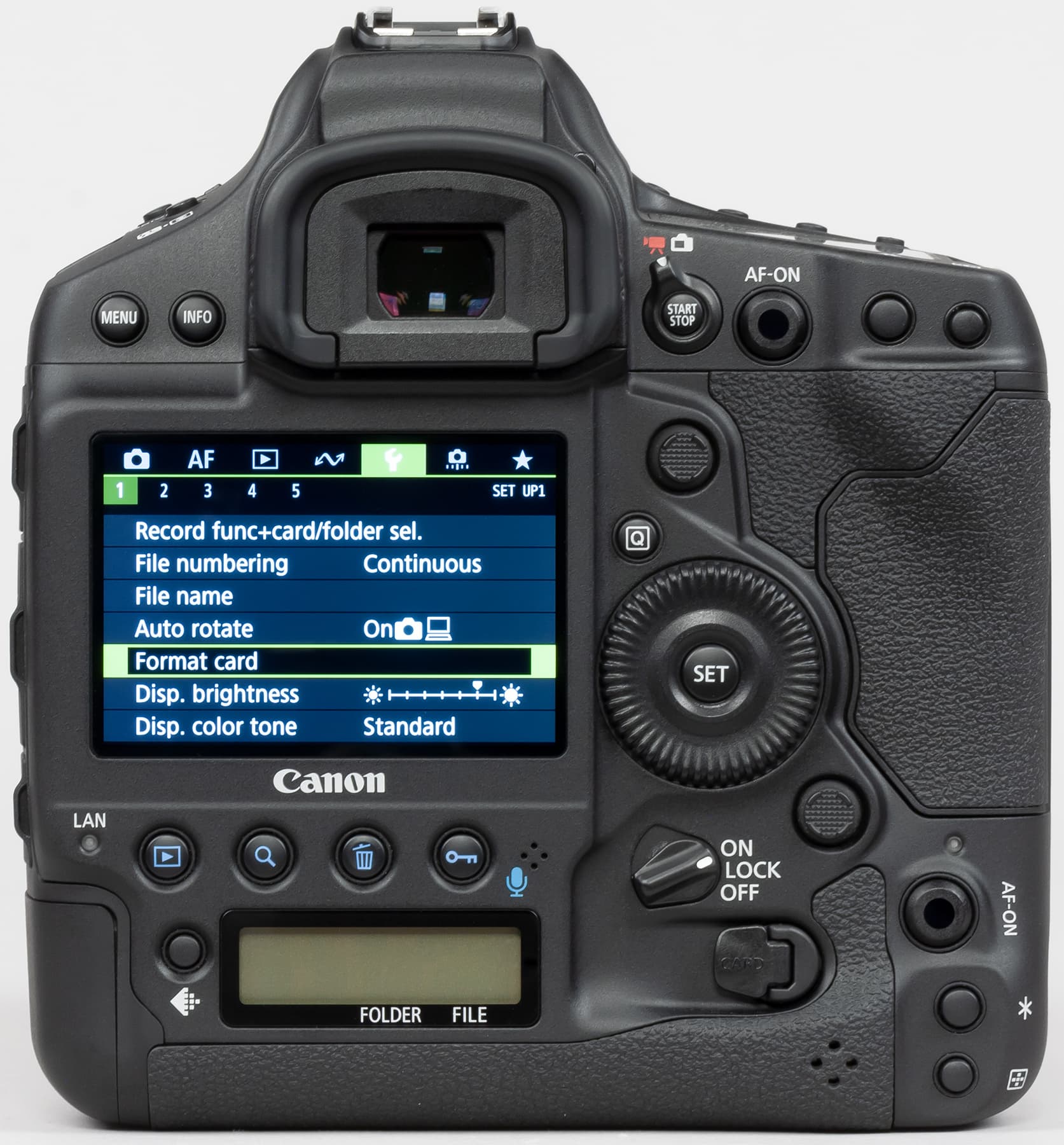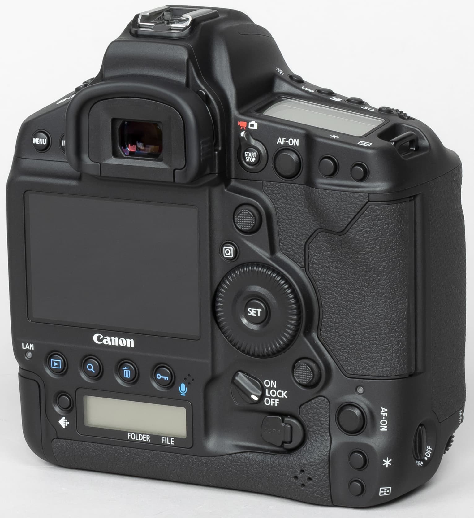 Другим признаком принадлежности Canon EOS-1D X Mark III к топовым профессиональным камерам следует считать наличие сразу двух ЖК-экранчиков на корпусе: один из них располагается на верхней поверхности корпуса, а другой — на задней.
