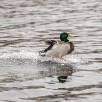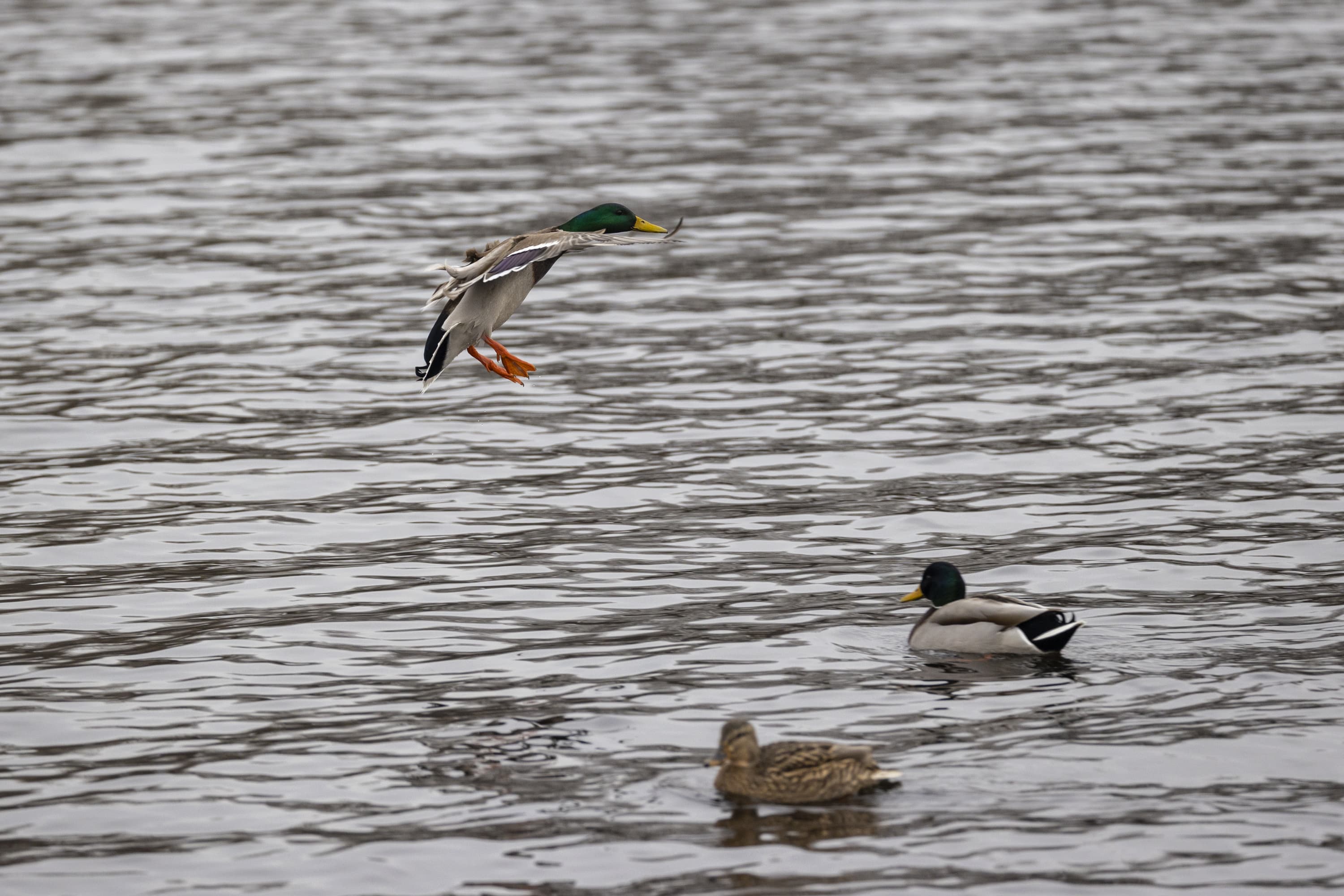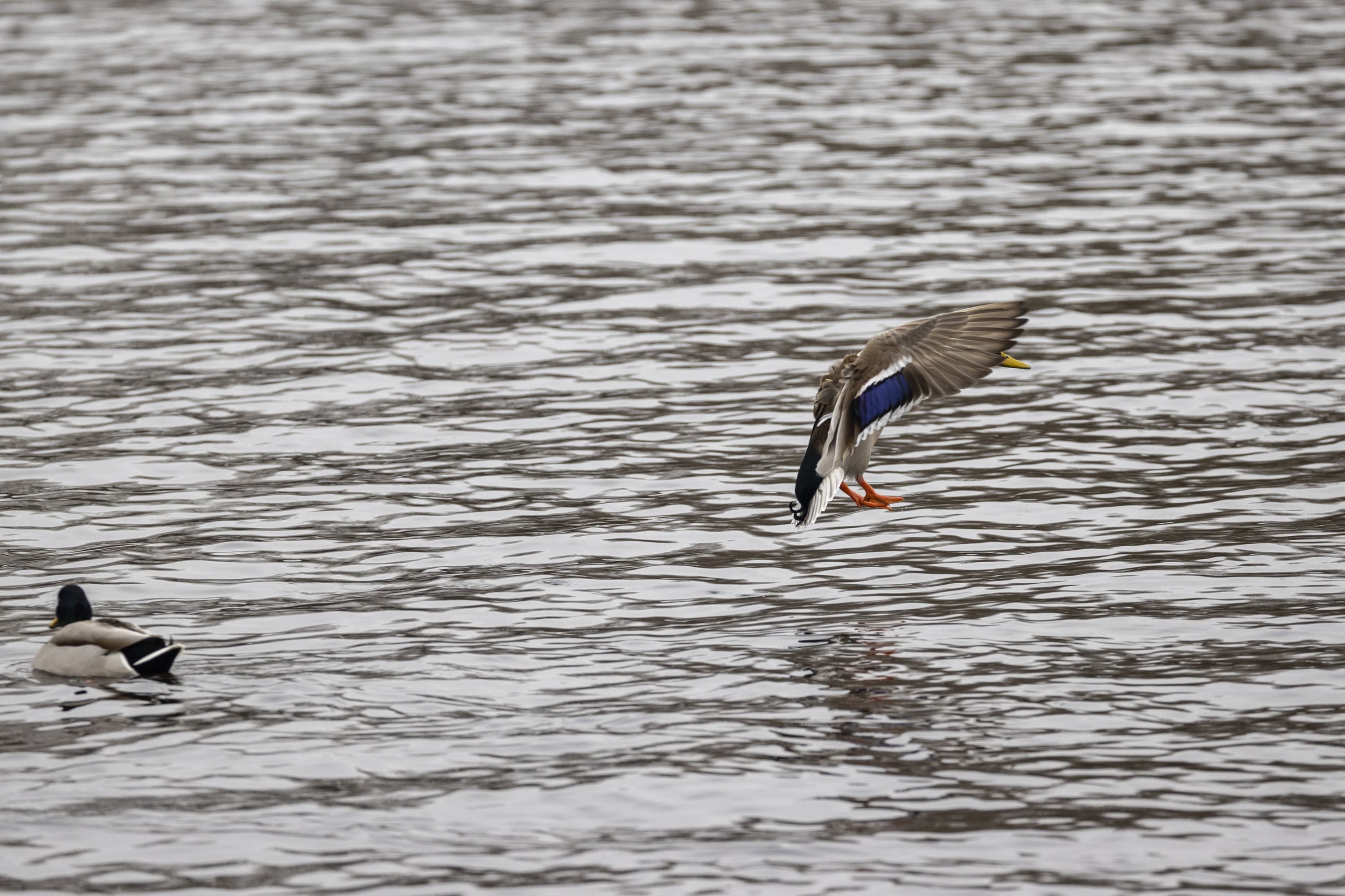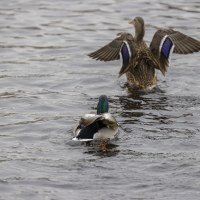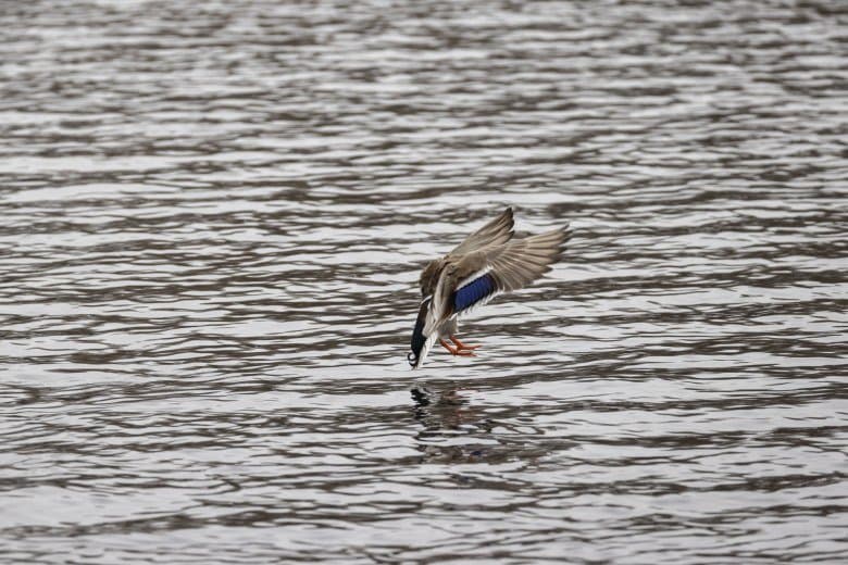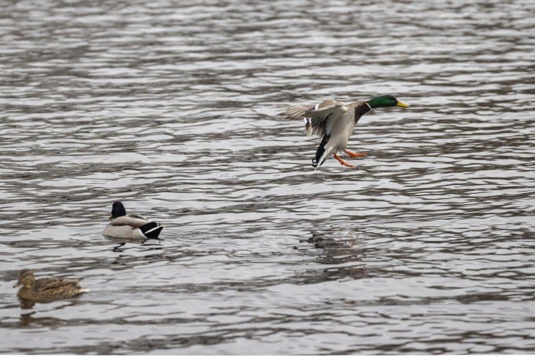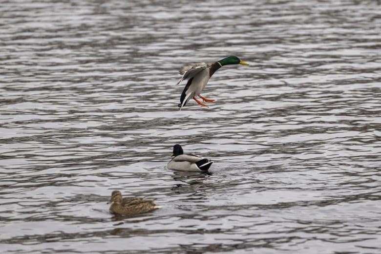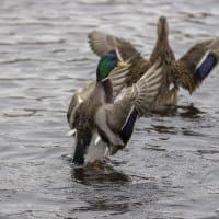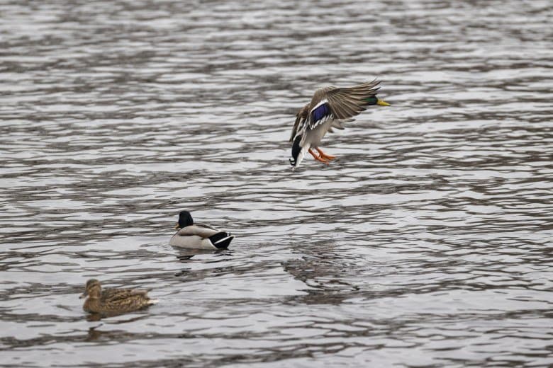 Теперь следует усложнить задачу, поставленную автоматике. На снимках ниже запечатлен процесс посадки на воду утки (ближе к нам) и селезня (дальше от нас). Сфокусируемся на селезне и посмотрим, не ошибается ли автофокус, переключившись на утку, которая летит ближе к камере и почти перекрывает селезня в поле зрения объектива. Фокусное расстояние 400 мм; F6,3; 1/1600 c; ISO 500. 9 кадров.