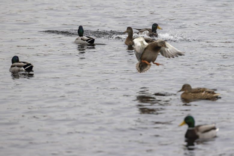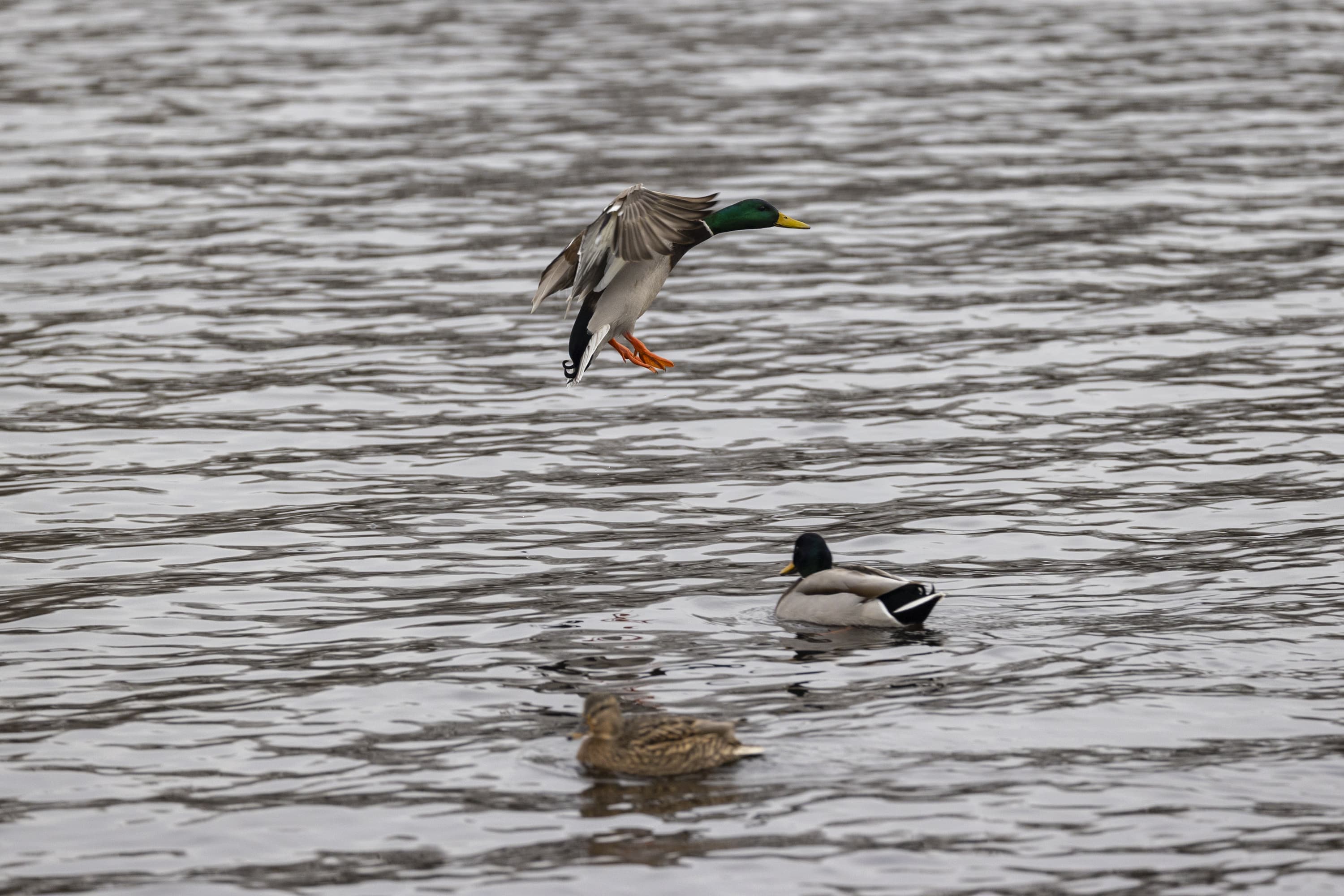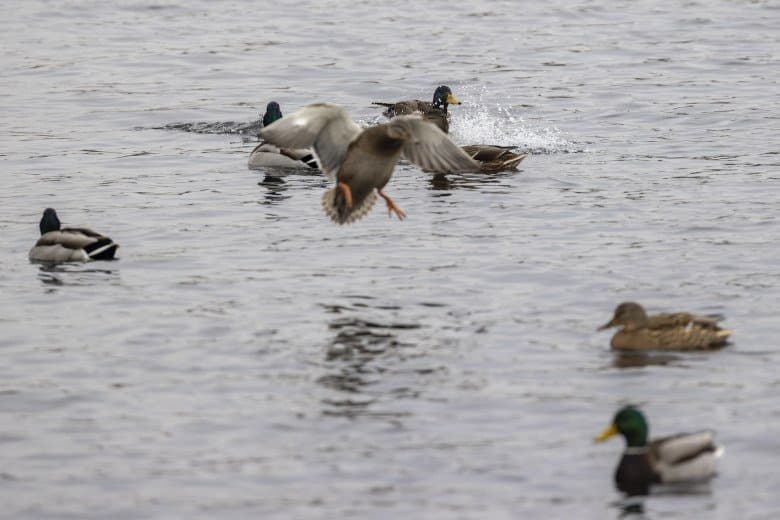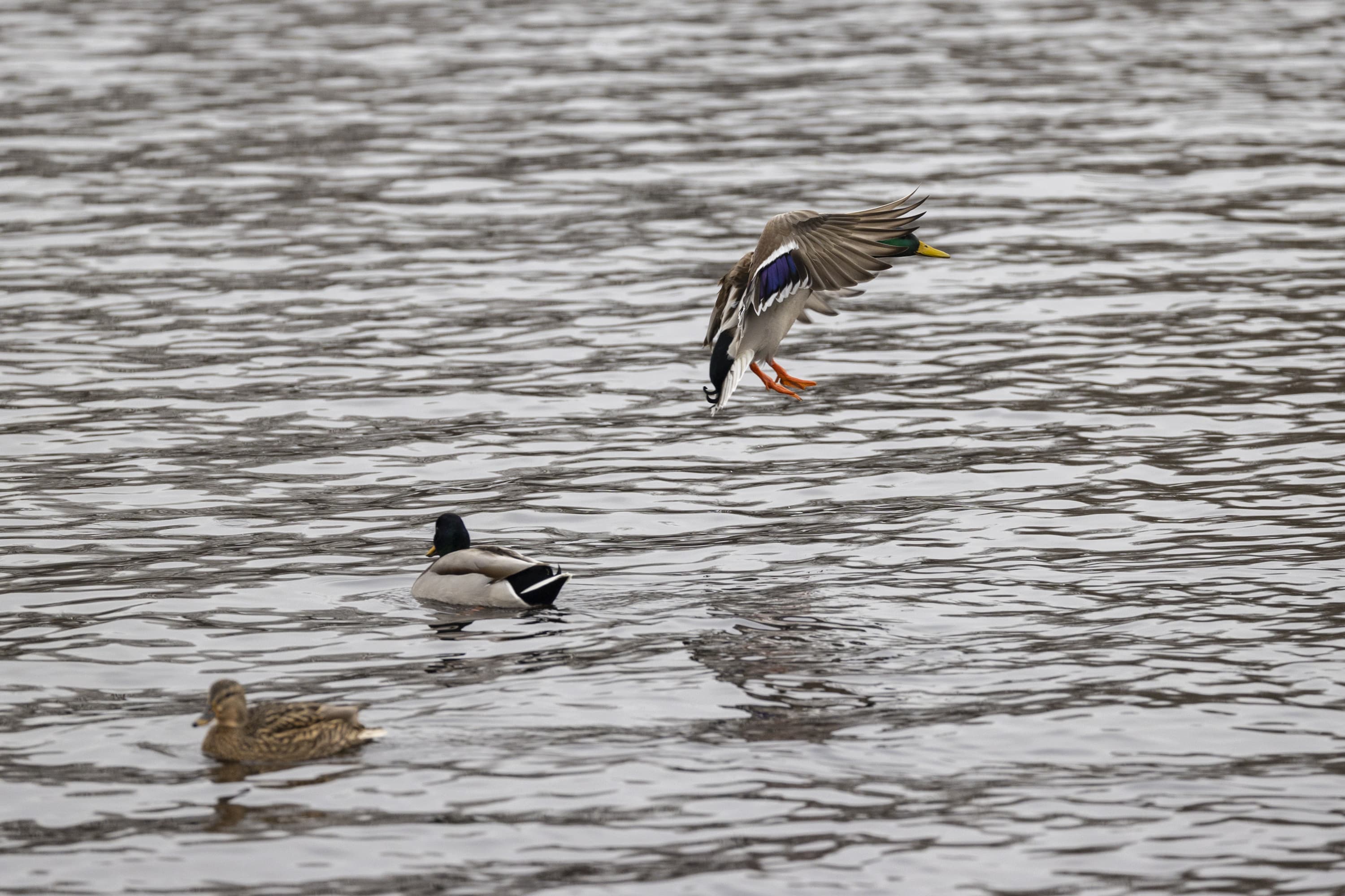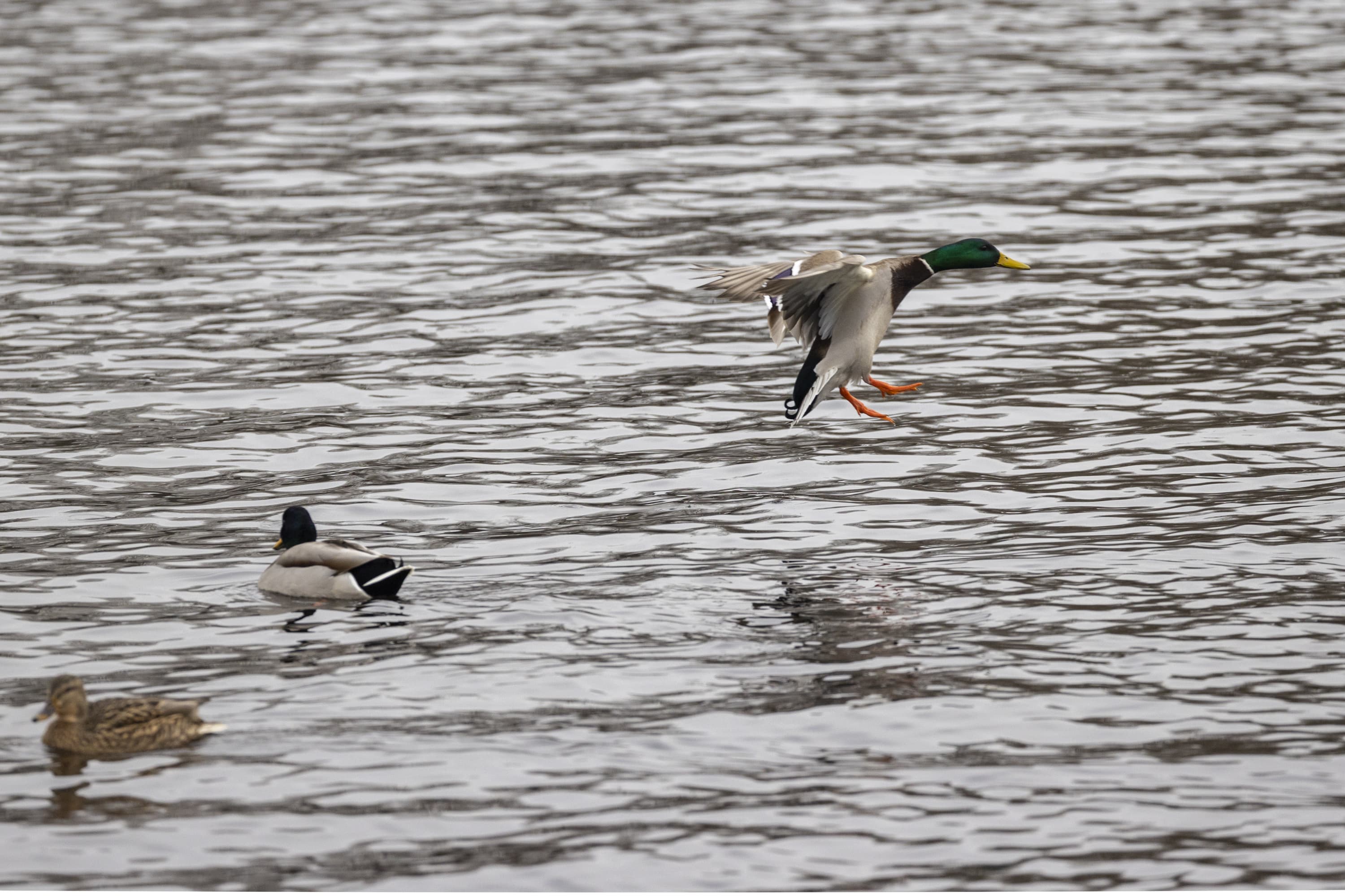Теперь следует усложнить задачу, поставленную автоматике. На снимках ниже запечатлен процесс посадки на воду утки (ближе к нам) и селезня (дальше от нас). Сфокусируемся на селезне и посмотрим, не ошибается ли автофокус, переключившись на утку, которая летит ближе к камере и почти перекрывает селезня в поле зрения объектива. Фокусное расстояние 400 мм; F6,3; 1/1600 c; ISO 500. 9 кадров.