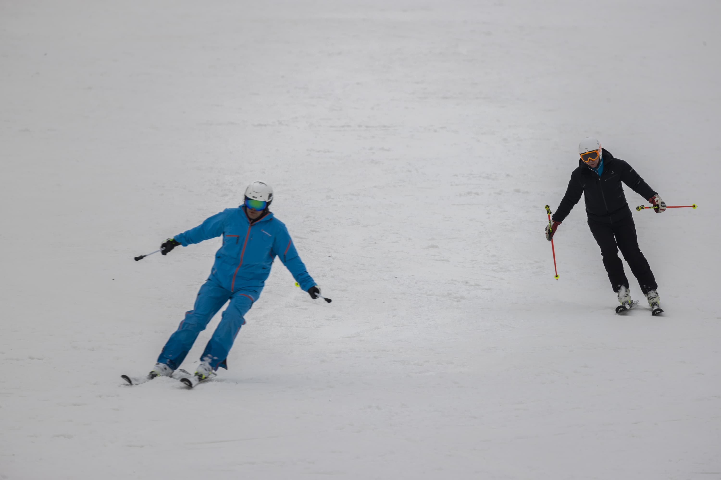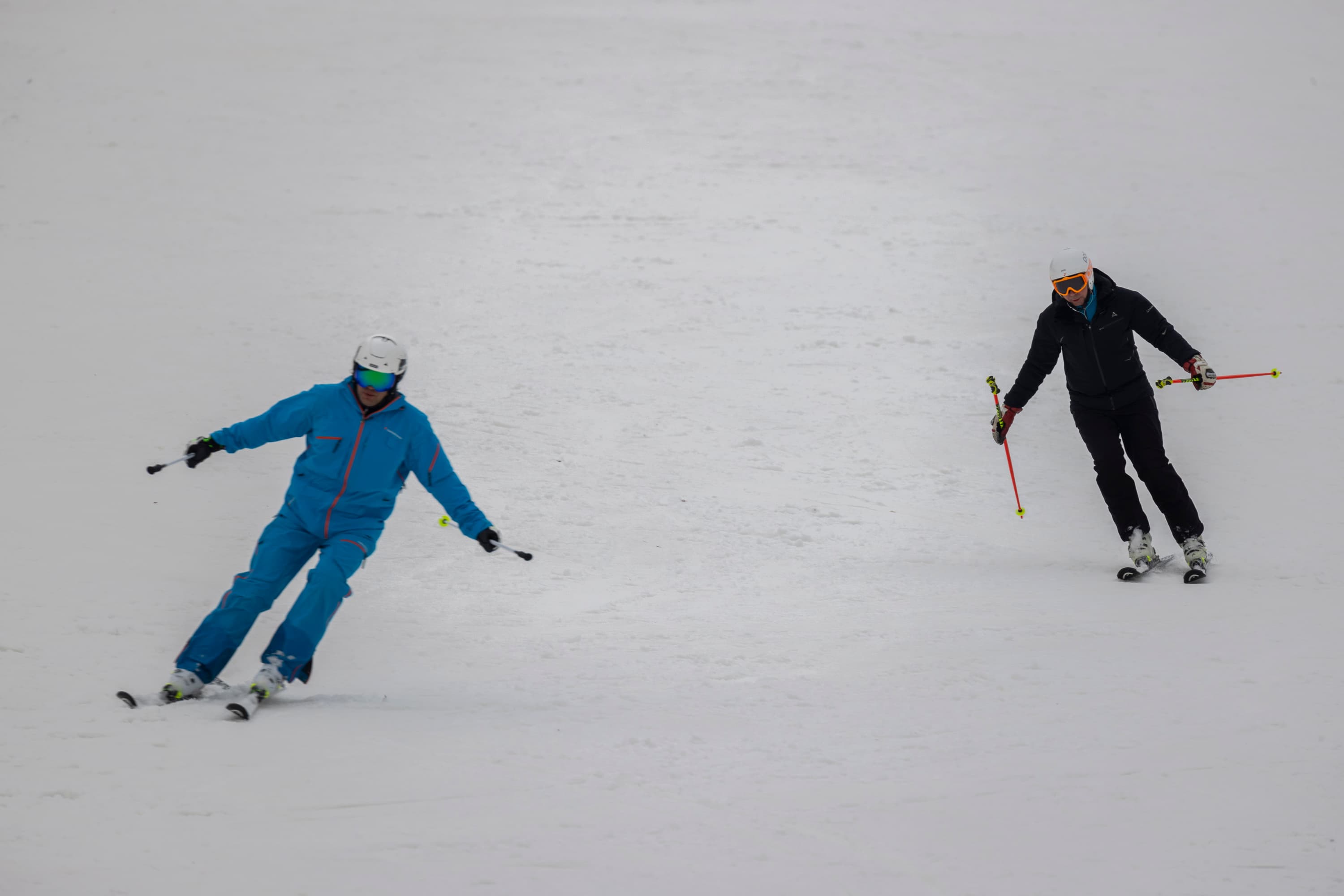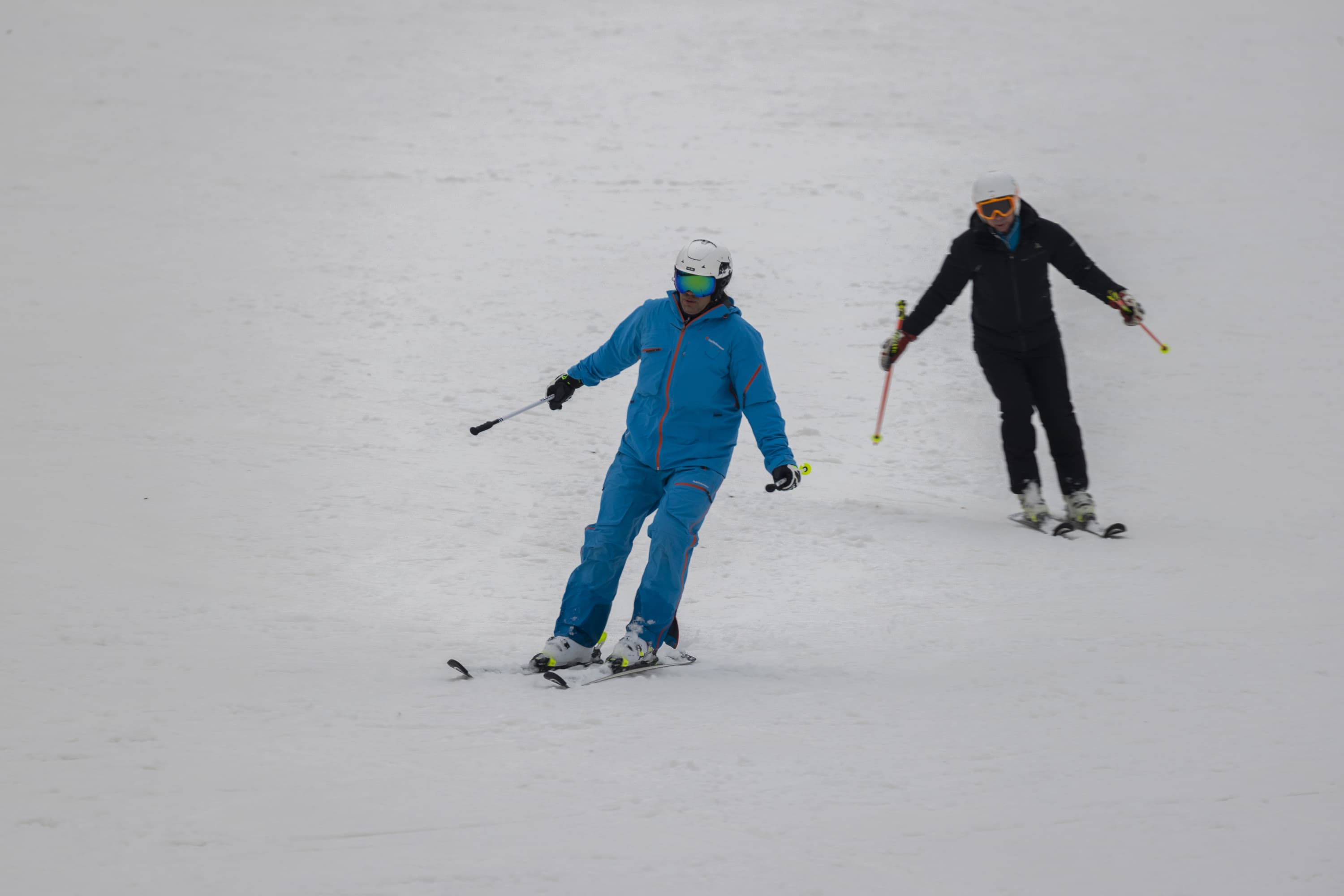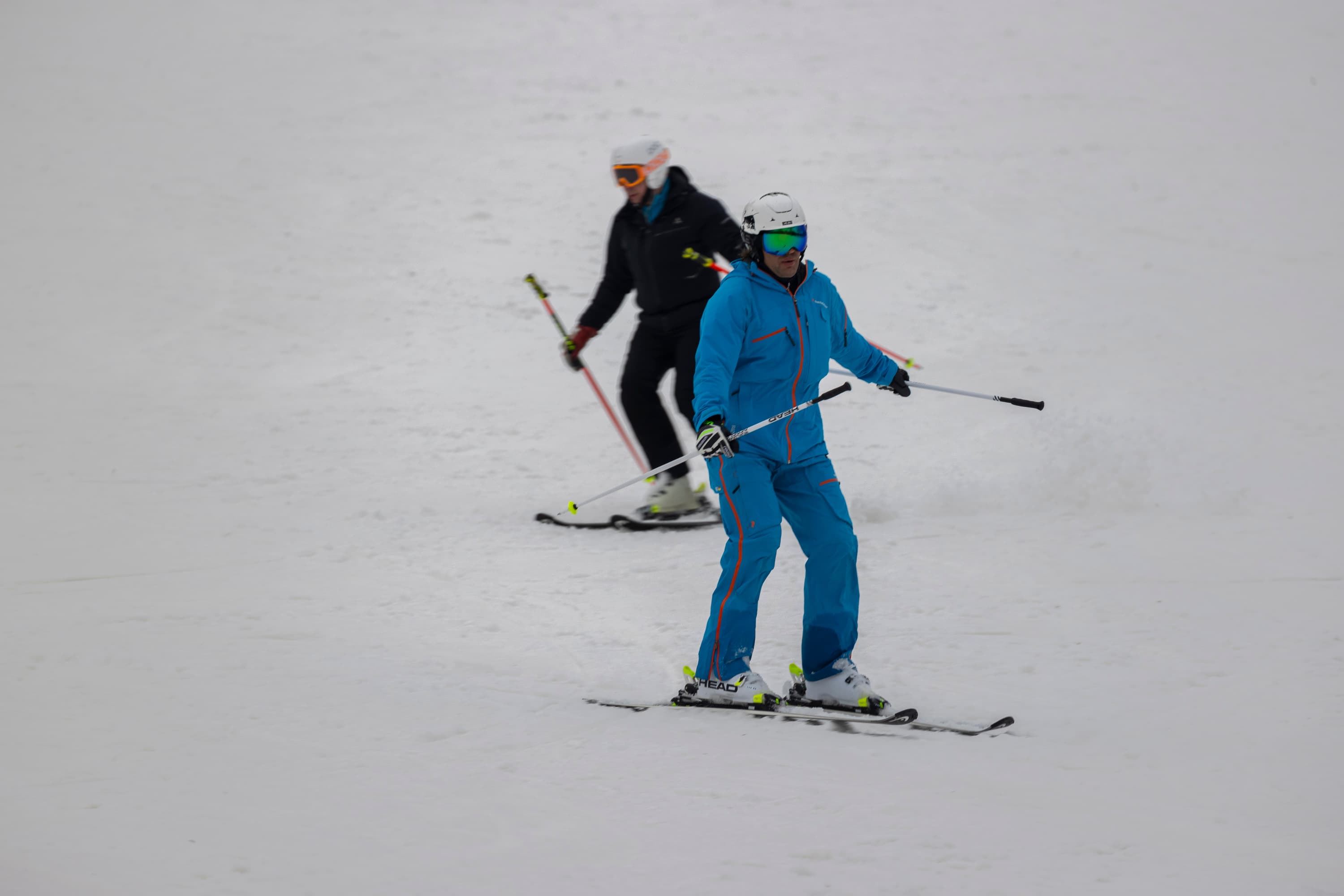 И последнее испытание. Снимаем парный горнолыжный спуск, при котором лыжники перемещаются, периодически перекрывая друг друга. Съемка события как единого процесса, тремя микросериями: 3 + 4 + 2 кадра при неизменном фокусном расстоянии. Интервал между ними — около 1 секунды. Фокусное расстояние 400 мм; F7,1; 1/500 c; ISO 100. Фокусировка по синему лыжнику.