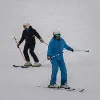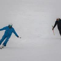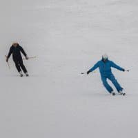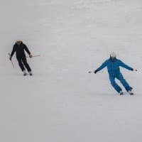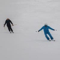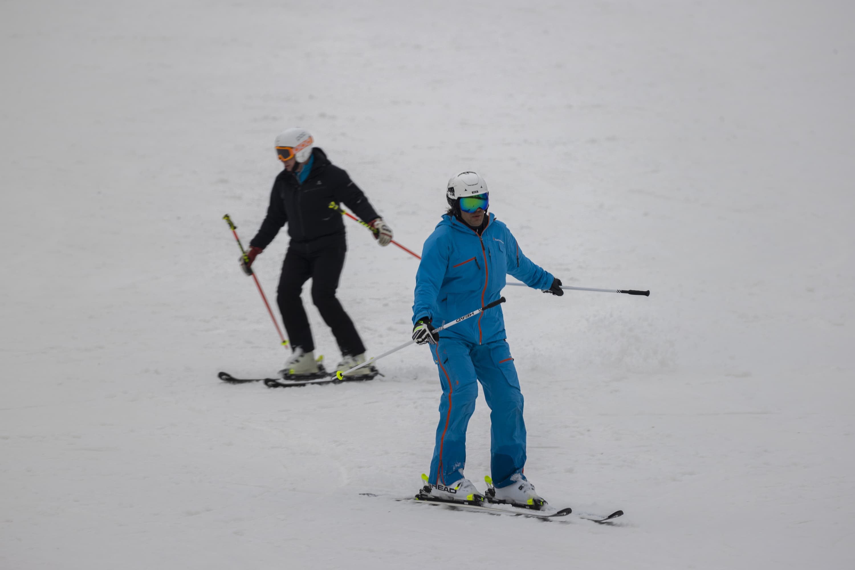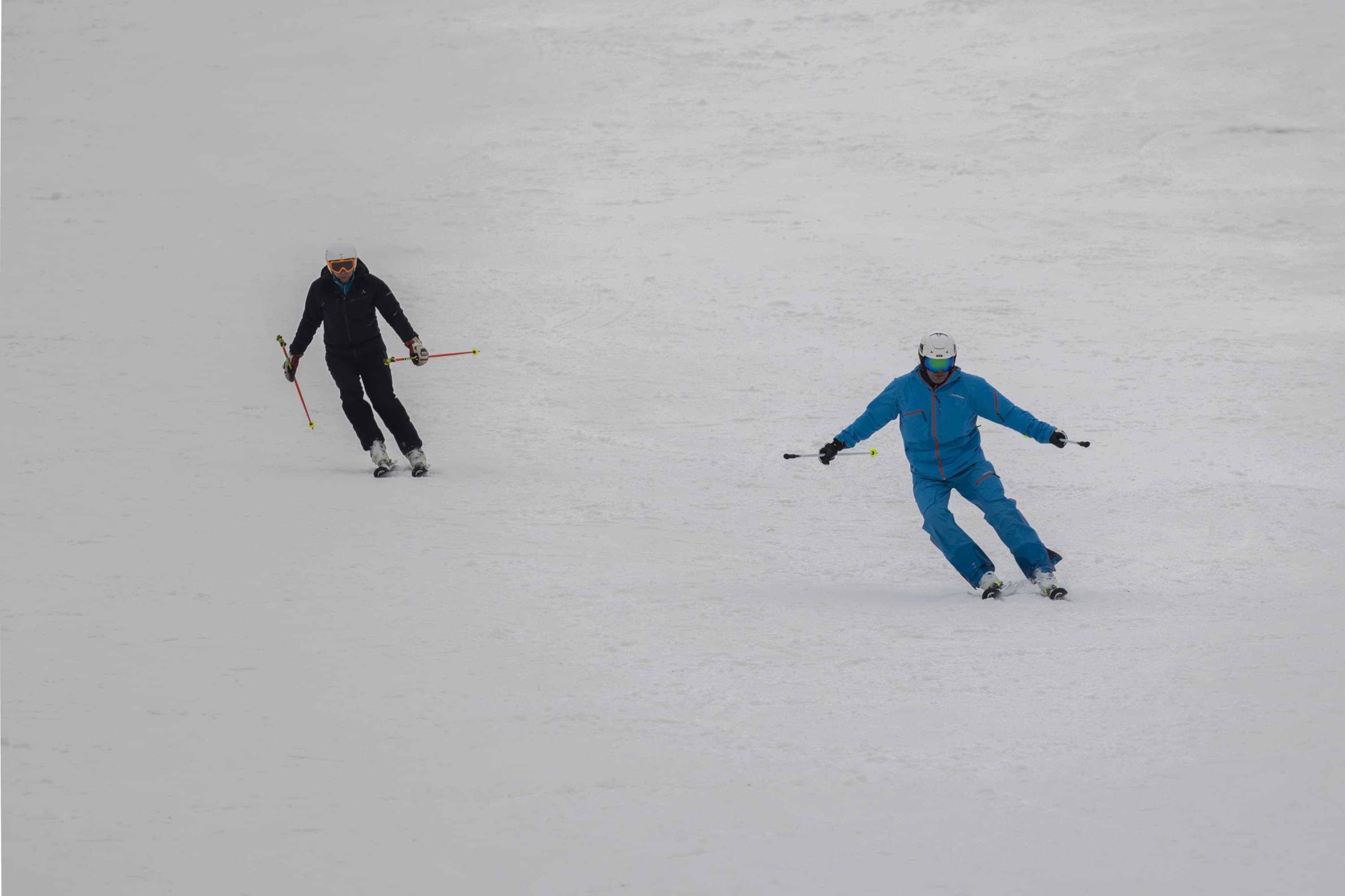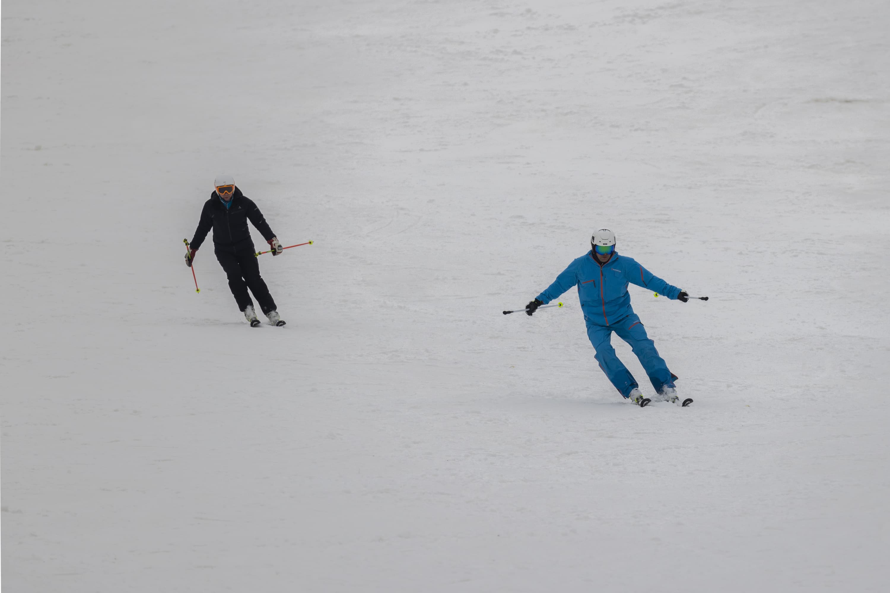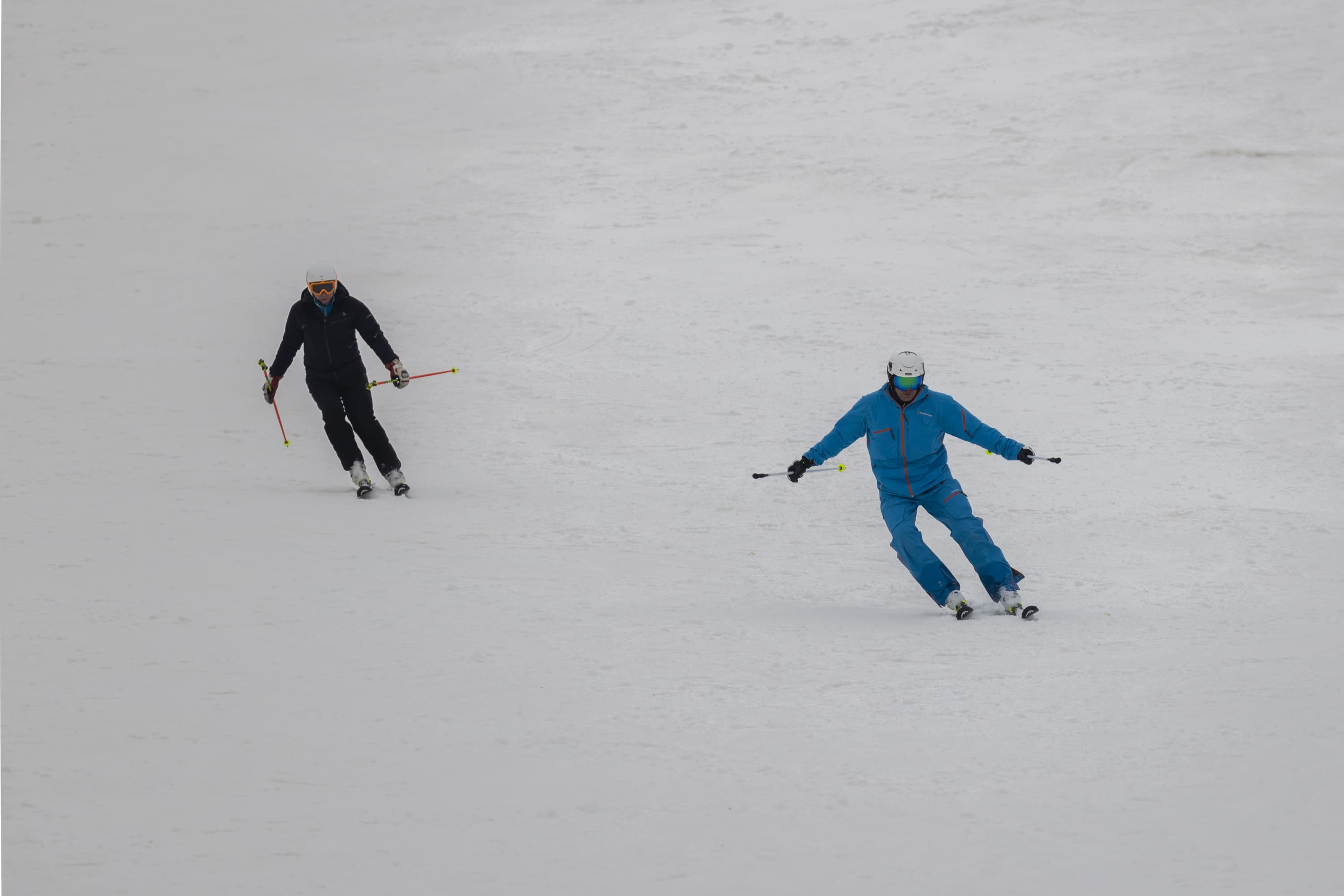 И последнее испытание. Снимаем парный горнолыжный спуск, при котором лыжники перемещаются, периодически перекрывая друг друга. Съемка события как единого процесса, тремя микросериями: 3 + 4 + 2 кадра при неизменном фокусном расстоянии. Интервал между ними — около 1 секунды. Фокусное расстояние 400 мм; F7,1; 1/500 c; ISO 100. Фокусировка по синему лыжнику.