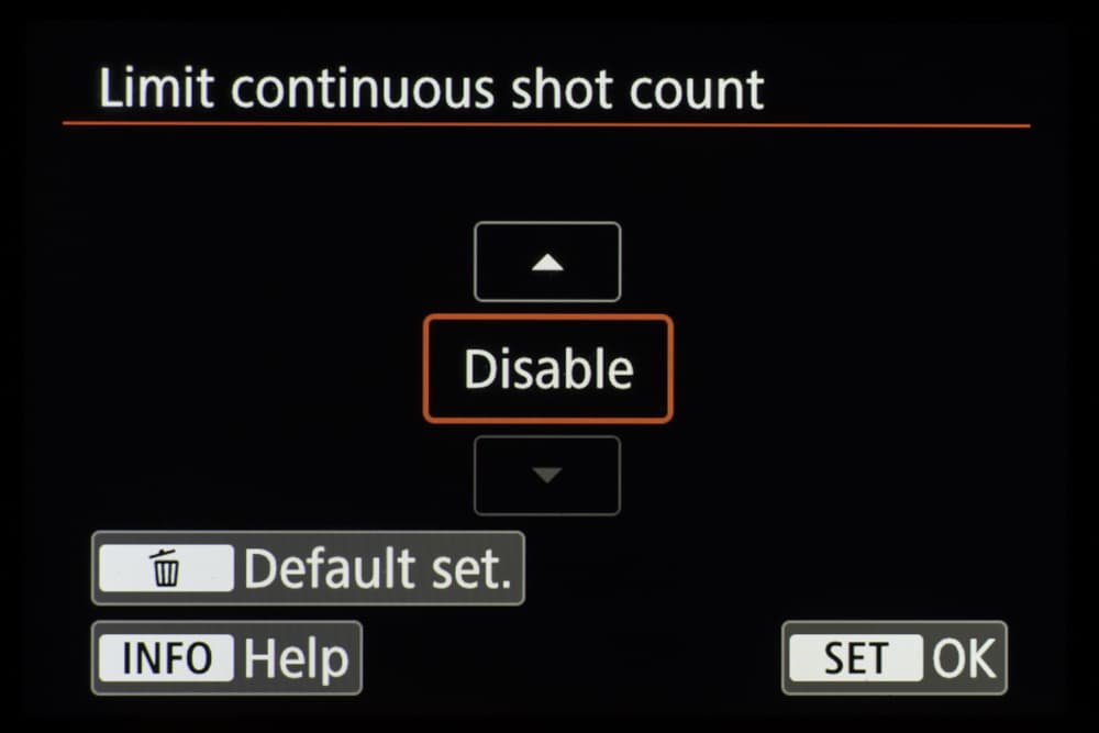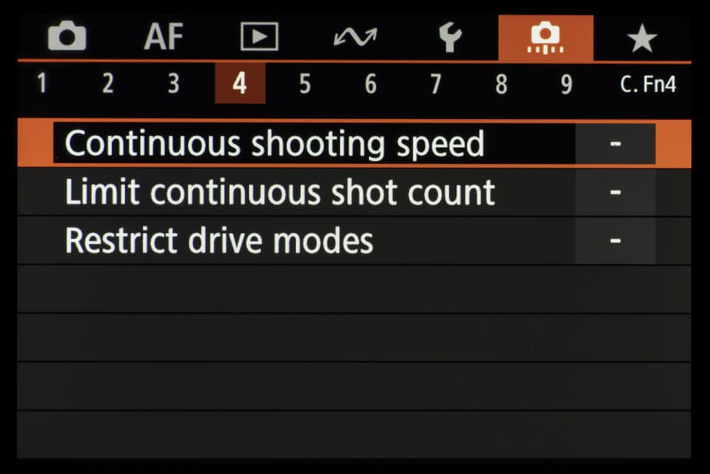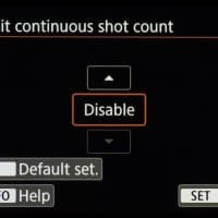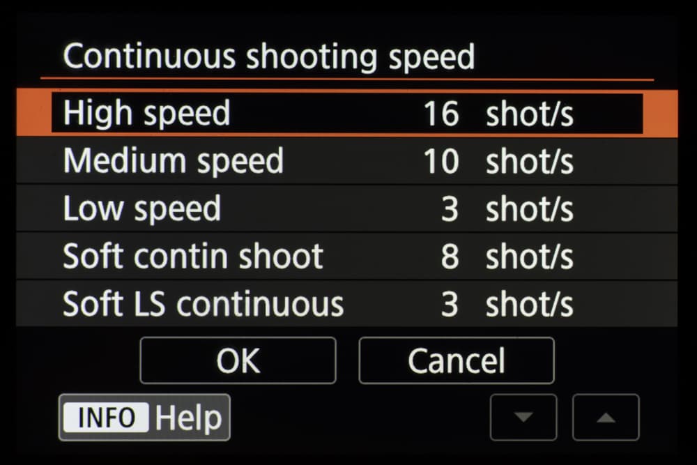 В таблице приведены значения средней скорости съемки для разных режимов. Первой скоростью назовем ту, с которой серийная съемка стартует. Ее предел — время, после которого съемка замедляется и продолжается со второй скоростью. Единицы измерения — кадры в секунду и секунды соответственно. Символ бесконечности означает, что при съемке ста кадров скорость не изменилась.