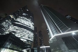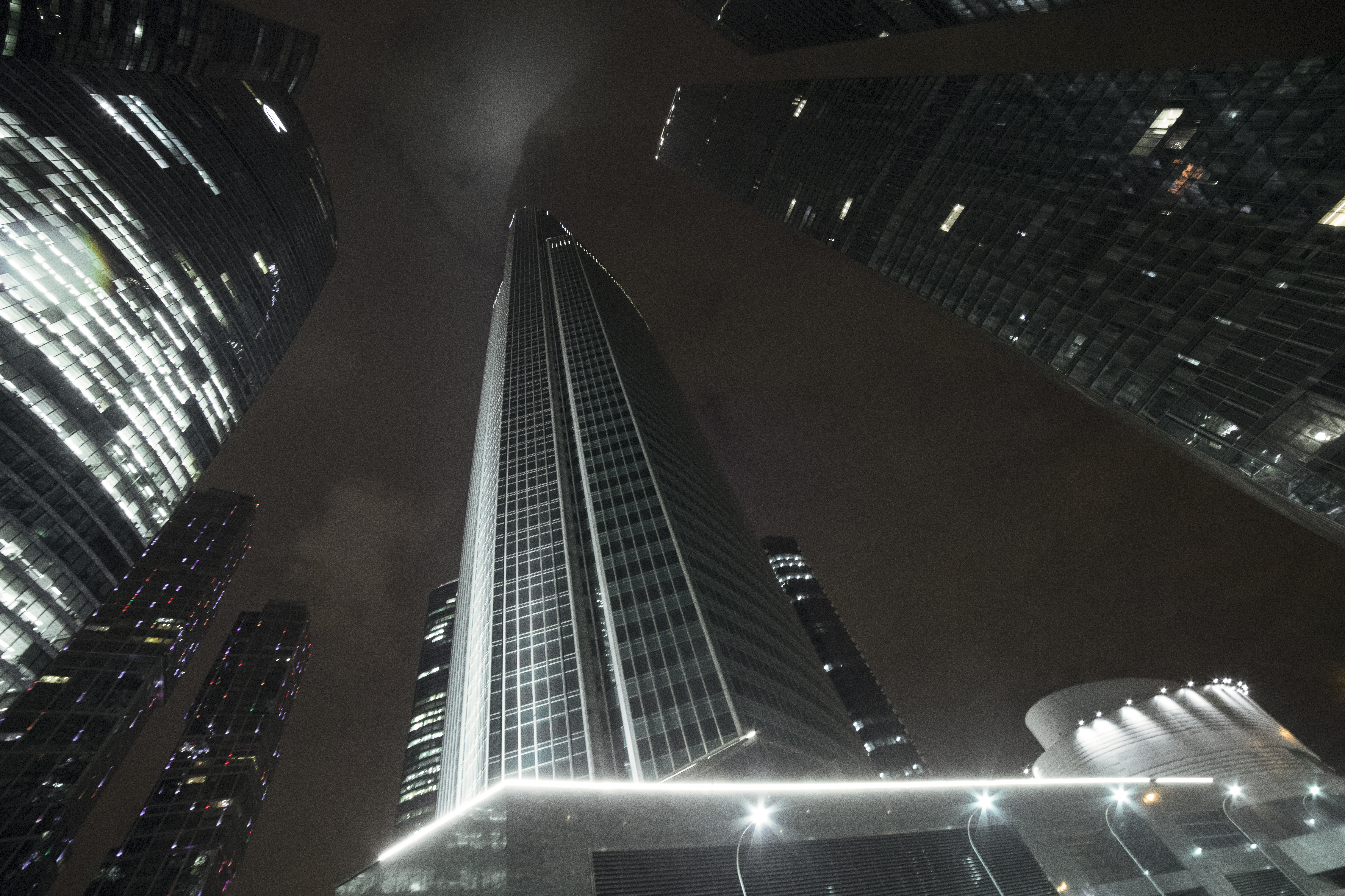 Обратимся к ночным сценам в Москва-Сити, снятым с помощью сверхширокоугольного объектива Samyang 14mm f/2.8 IF ED UMC. В качестве эталона приведем сначала результат при ISO 100; F2,8; 1,6 с (штатив).