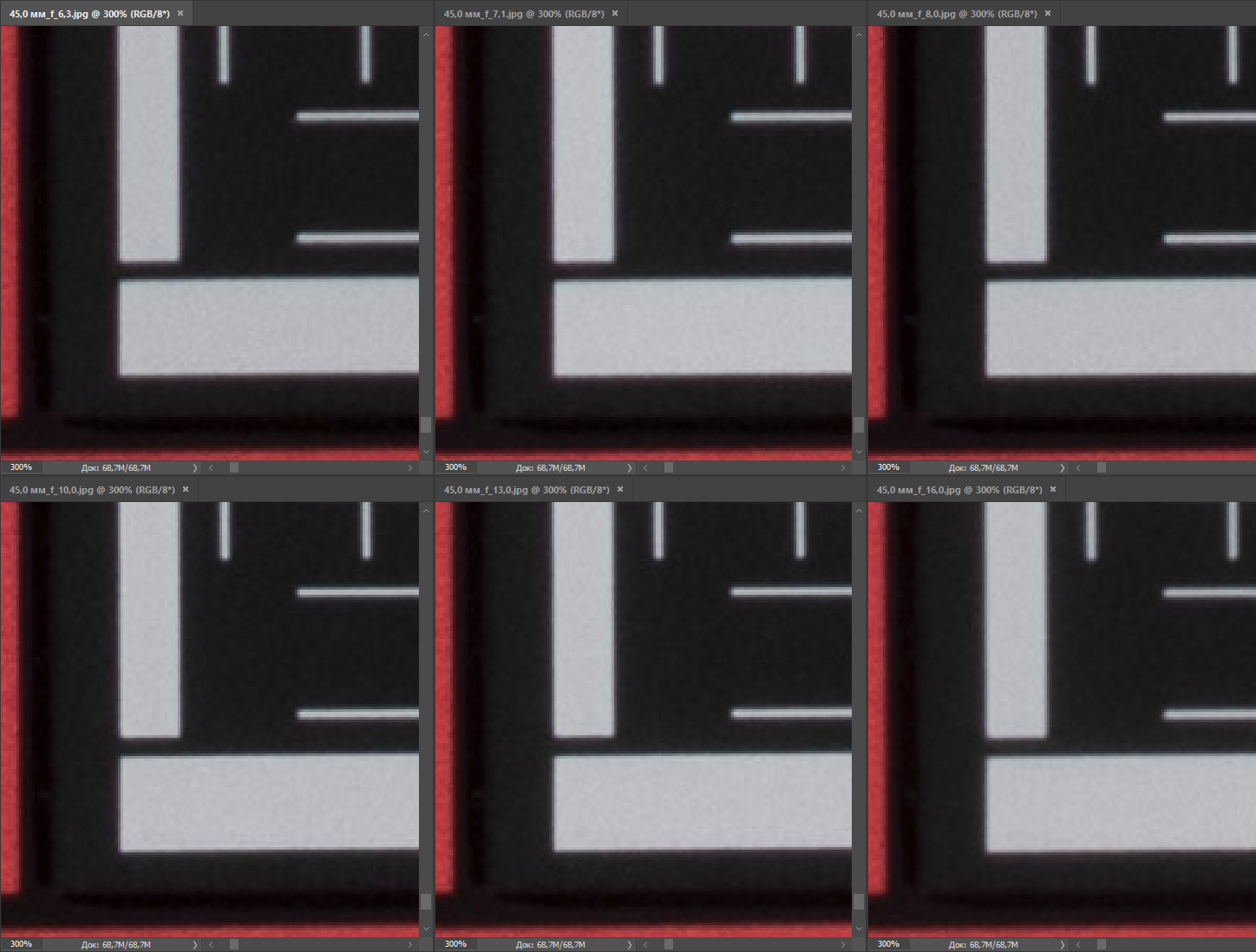 Среднее положение объектива демонстрирует более высокий результат: здесь оптика отрабатывает уже 80% сенсора, а на F8 — еще больше. Разрешение на краю кадра также стало выше, разрыв с центром уменьшился. Хроматические аберрации по-прежнему едва заметны, а вот в углах кадра можно обнаружить легкую бочкообразную дисторсию.