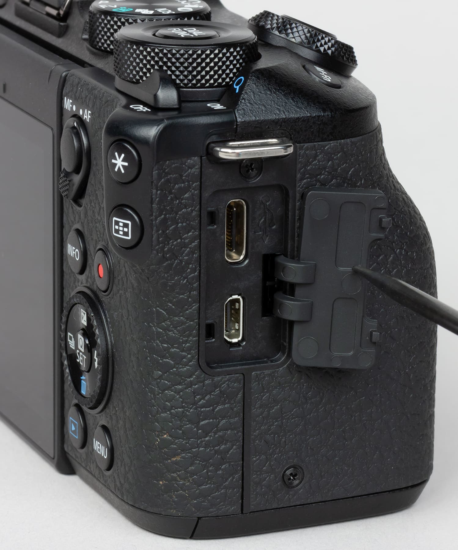 С противоположной стороны под другой общей заглушкой располагаются вход микрофона и разъем для подключения пульта дистанционного управления. Аудиовыход для наушников не предусмотрен.