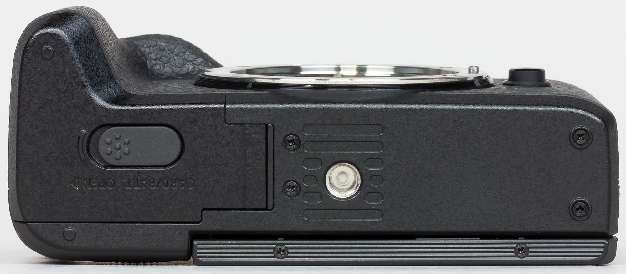 Снизу большую часть занимает крышка отсека для батареи и карты памяти, снабженная замком, и стандартная штативная резьба. При установке на штатив открыть отсек не получится.