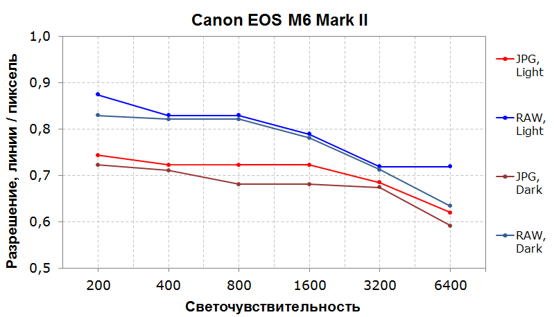 Сразу же в глаза бросается отсутствие различий в темной и светлой сцене — сенсор эффективно борется с различными шумами. С увеличением светочувствительности разрешение также падает плавно: RAW в светлой сцене выдает более 70% на ISO 6400 — это неплохой результат для сенсора APS-C.