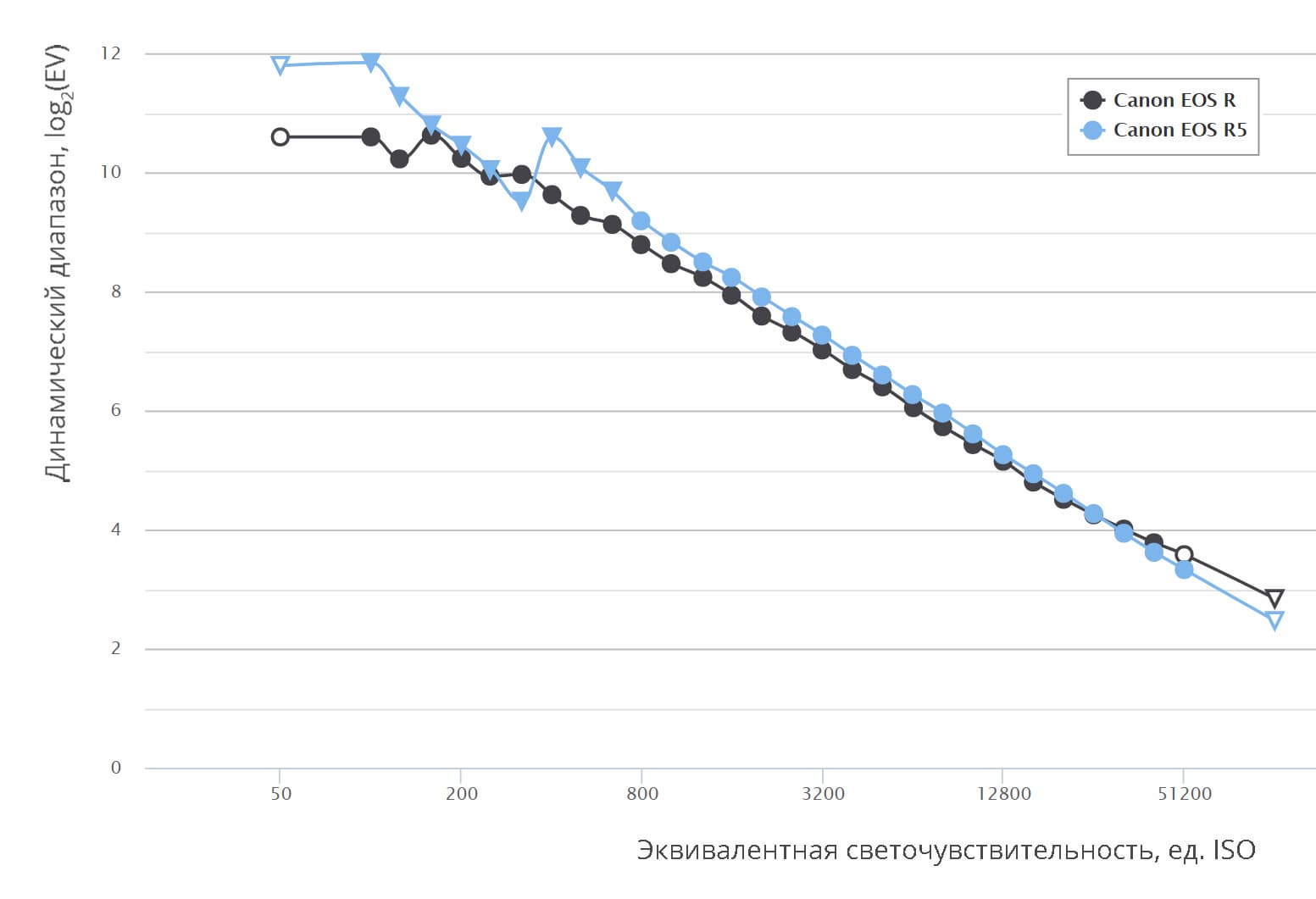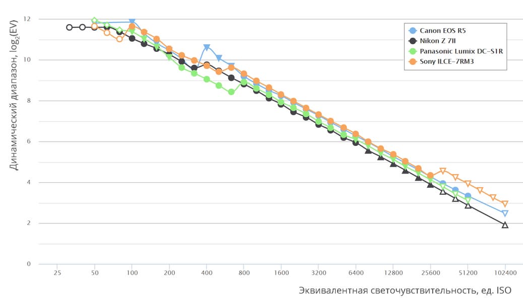 На приведенных кривых треугольниками обозначены данные, в которых есть влияние алгоритмов шумоподавления; а незакрашенными фигурами маркированы показатели, находящиеся вне пределов рабочего диапазона ISO выбранных камер. Картина демонстрирует очевидное превосходство сенсора Canon EOS R5, который по ДД опережает предшественницу почти на полторы ступени экспозиции.