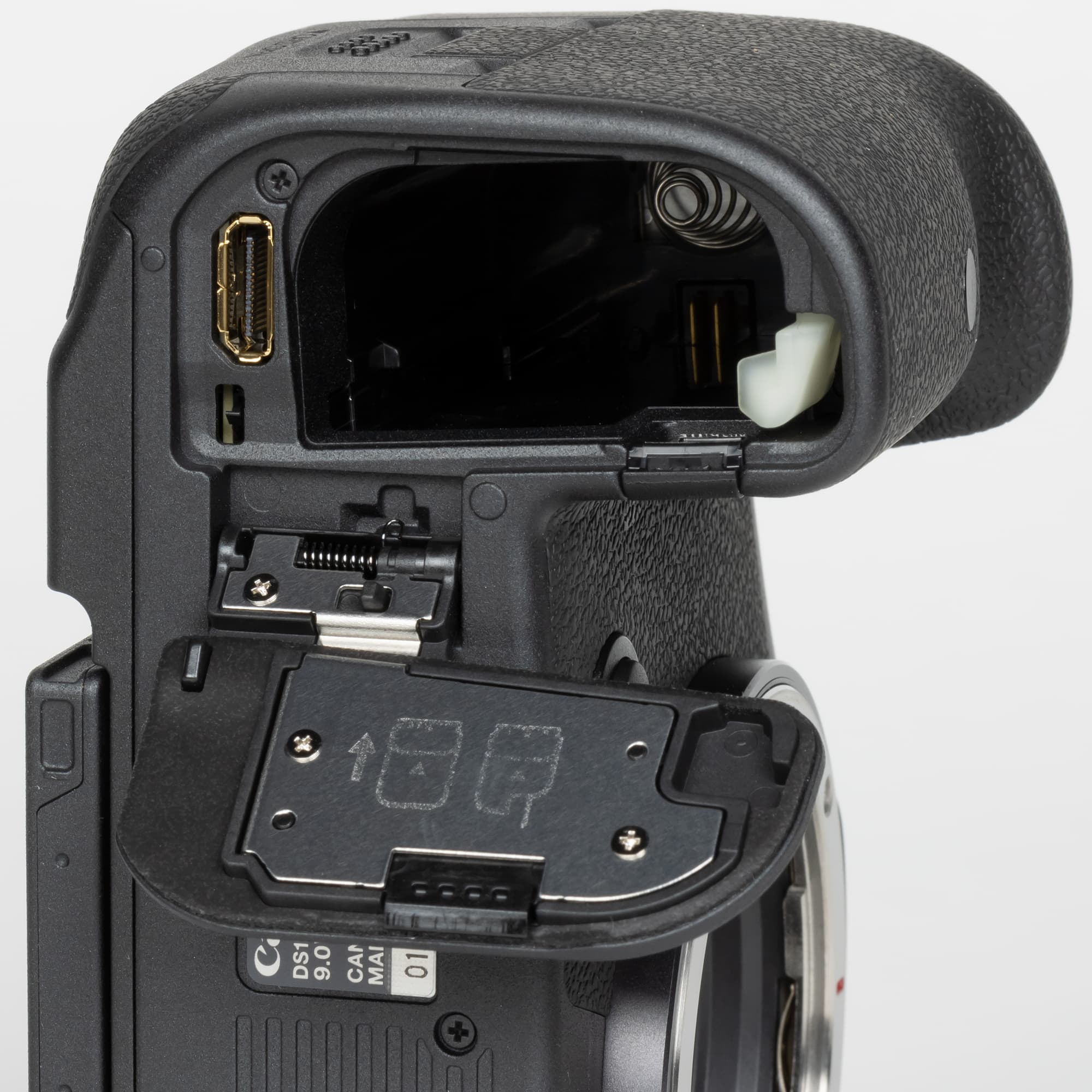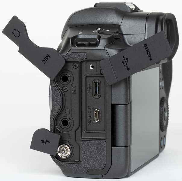 Под резиновыми заглушками на левой боковой панели камеры расположены аудиоразъемы, коаксиальный синхроконтакт для подключения импульсных осветителей, коннекторы Micro-HDMI и USB Type C.