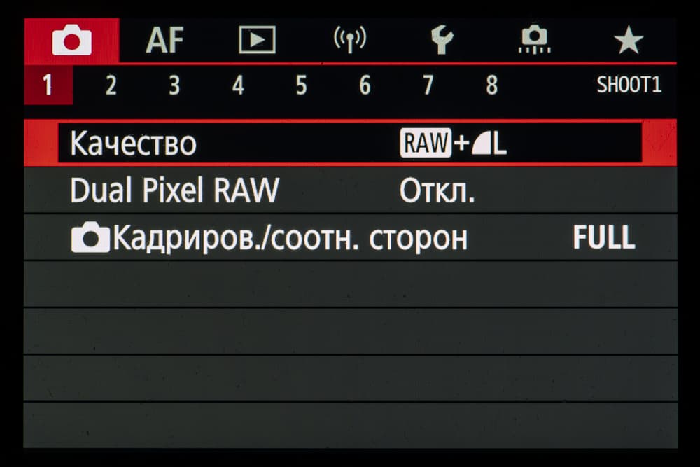 Испытания камеры в реальных условиях мы проводили с объективом Canon RF 24-105mm F4L IS USM. Для фотосъемки выбрали следующие параметры: