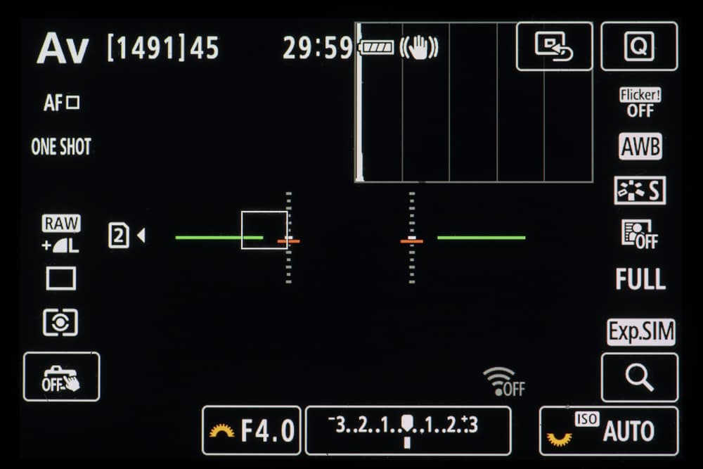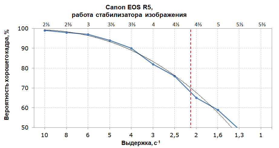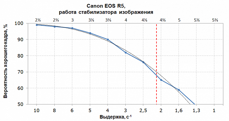 Производитель указывает эффективность в 8 ступеней при работе тандема стабилизаторов объектива и сенсора, однако при попытках активировать стабилизацию изображения камера ведет себя странно: бывает, что из меню попросту пропадает пункт настроек стабилизатора после подключения объектива Canon RF 24-105mm F4L IS USM. В итоге не совсем понятно, работают ли оба стабилизатора или только объектив. Наша методика позволяет оценить эффективность стабилизатора примерно в 4,5 ступени экспозиции с выходом годных 70% — это хороший результат, однако он очень далек от заявленного.