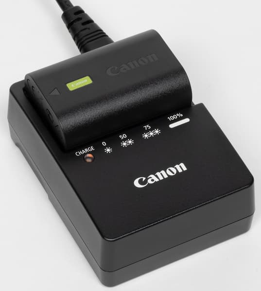 Зарядка батареи производится фирменным зарядным устройством LC-E6E, которое поставляется в комплекте с камерой.