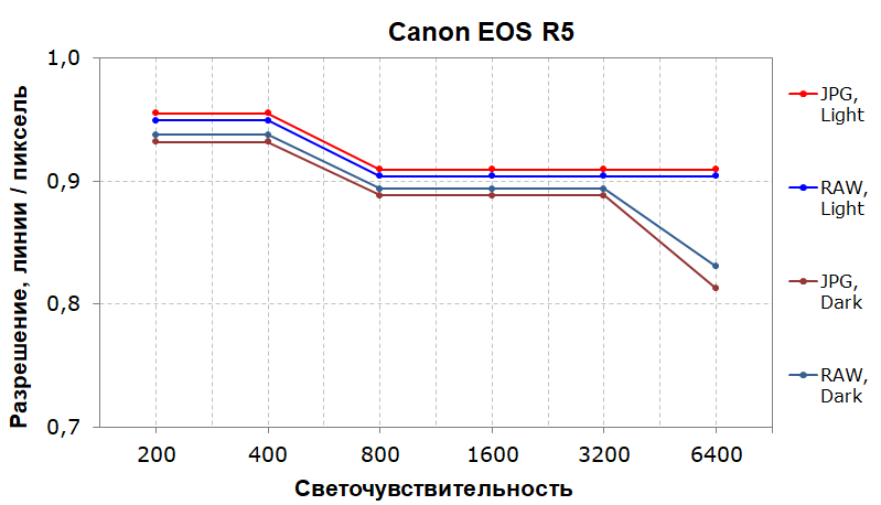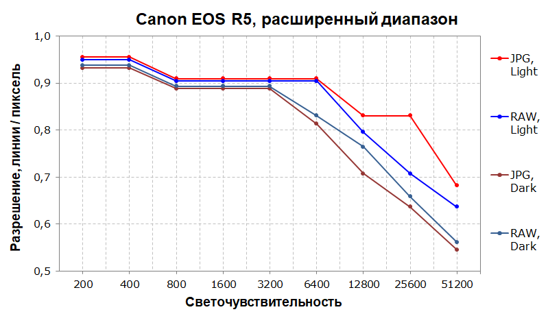 В расширенном диапазоне светочувствительности кривые выглядят хуже. Как ни странно, наиболее высокая разрешающая способность получается при съемке в JPEG, она падает ниже 70% только на ISO 51200.