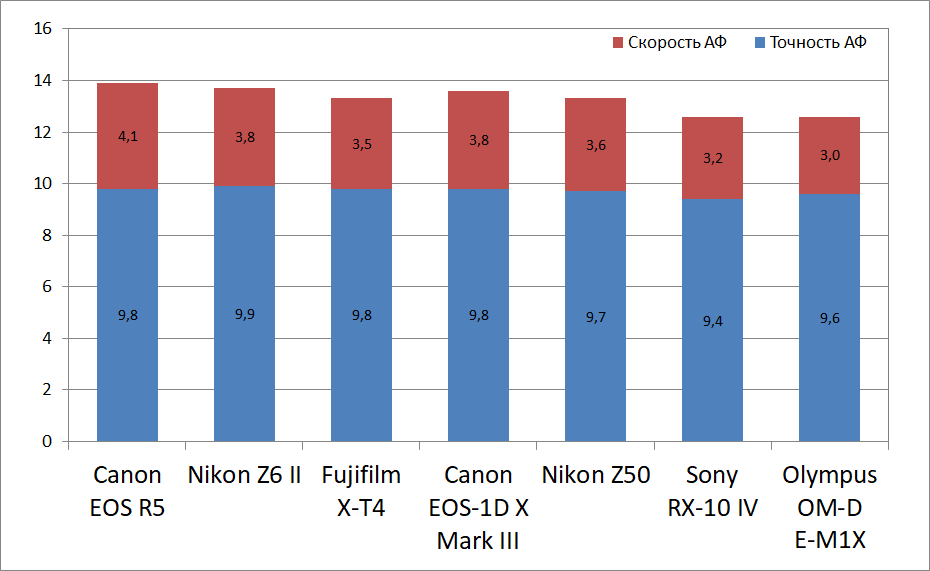 На данный момент Canon EOS R5 занимает первое место в нашем рейтинге, подвинув недавнего лидера Nikon Z6 II. По точности камера практически идеальна, хотя и уступает немного прошлому лидеру рейтинга. Во всяком случае, точность у нее не хуже, чем у Canon EOS RP. Зато по скорости R5 уверенно обгоняет всех участников нашего рейтинга.