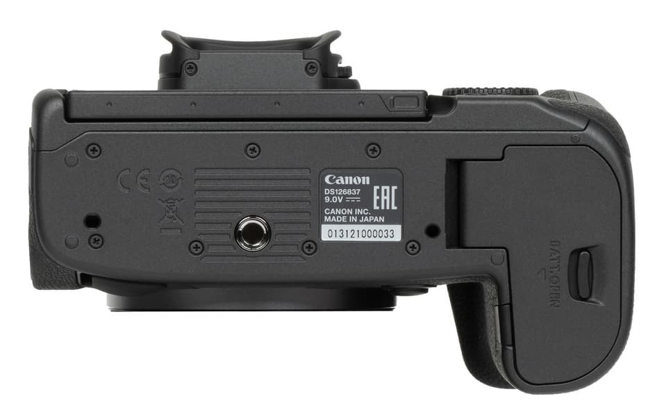 Снизу расположена стандартная штативная резьба и крышка отсека для аккумуляторной батареи.