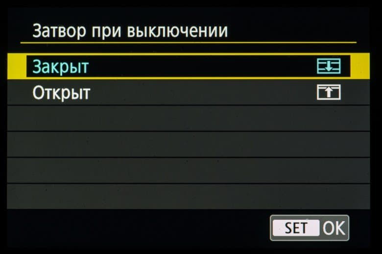 В меню можно выбрать, в каком состоянии оставлять затвор по окончании работы: в открытом или в закрытом.