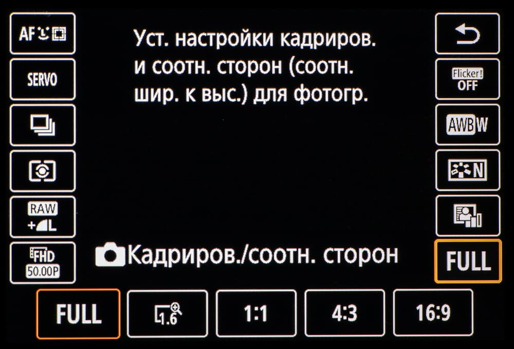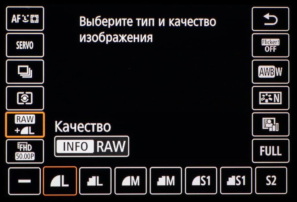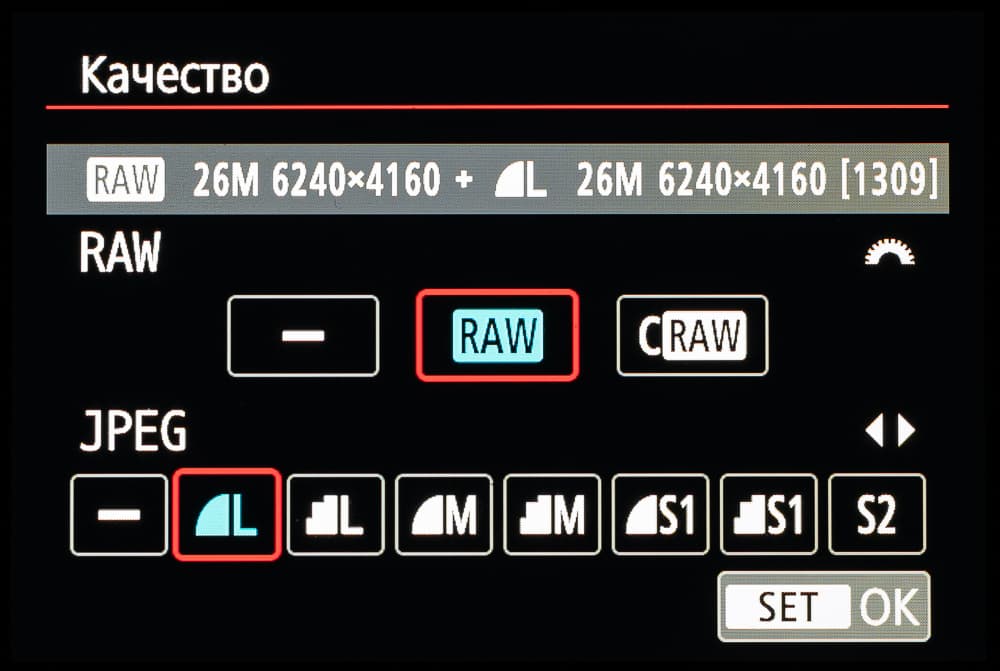 | Формат записи фотоснимков | 3:2: L, RAW, C-RAW 6240×4160, M1 4160×2768, S1 3120×2080, S2 2400×1600; 3:2 с масштабированием 1,6×: L 3888×2592, S2 2400×1600; 4:3: L 5536×4160, M1 3680×2768, S1 2768×2080, S2 2112×1600; 16:9: L 6240×3504, M1 4160×2336, S1 3120×1752, S2 2400×1344; 1:1: L 4160×4160, M1 2768×2768, S1 2080×2080, S2 1600×1600 |