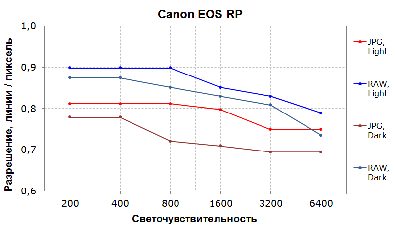 Сенсор работает стабильно во всем диапазоне испытаний, при этом и RAW, и JPEG демонстрируют высокий результат. RAW в светлой сцене выдает 90% — чуть ниже, чем у старшей модели EOS R. А вот в темной сцене RAW у EOS RP выглядит даже немного лучше. Впрочем, разница не такая уж большая. JPEG в светлой сцене отрабатывает примерно на 80% почти во всем диапазоне, в темной сцене падает до 70% начиная с ISO 800, что тоже неплохо.