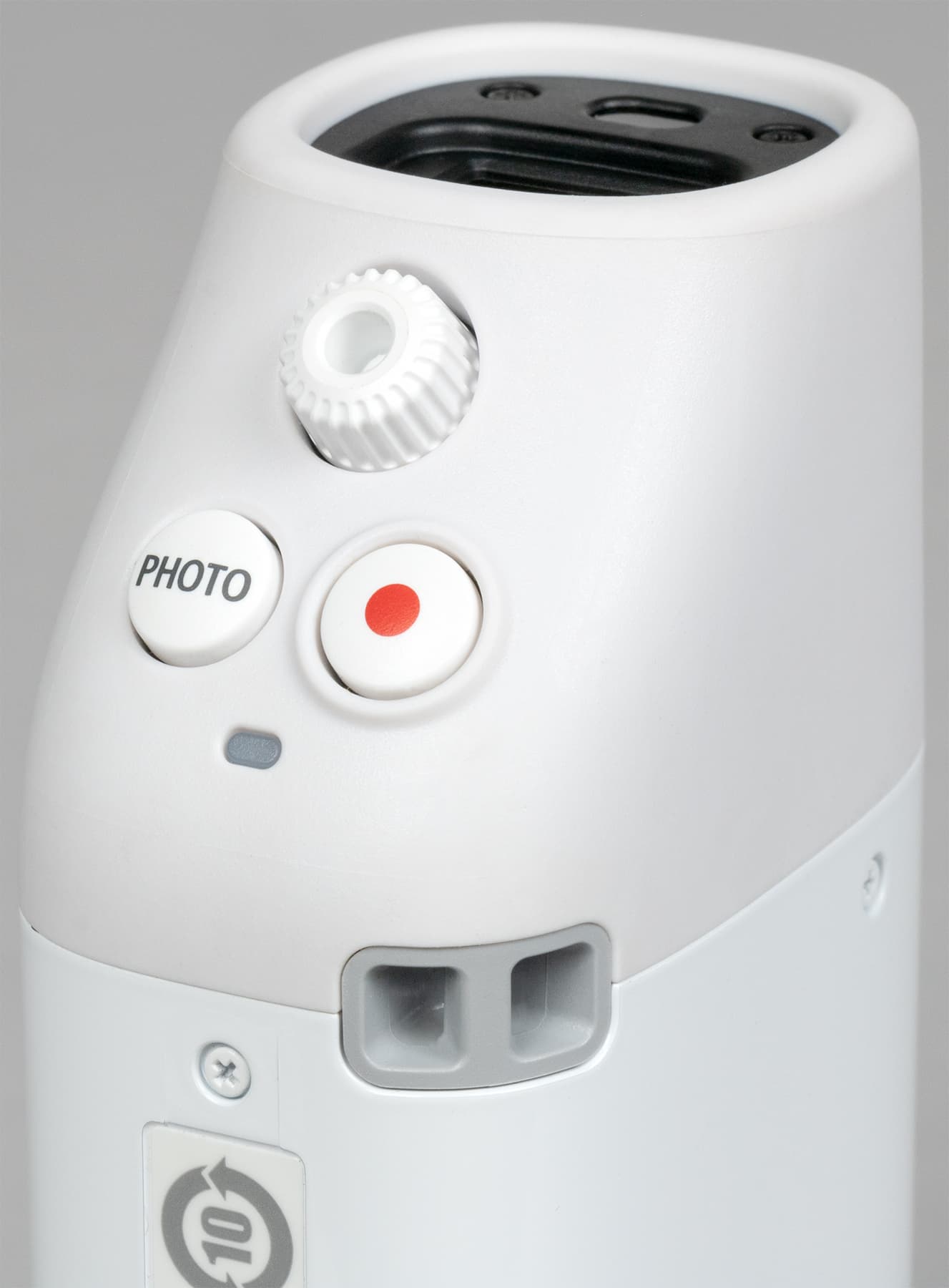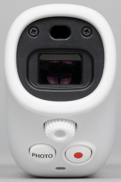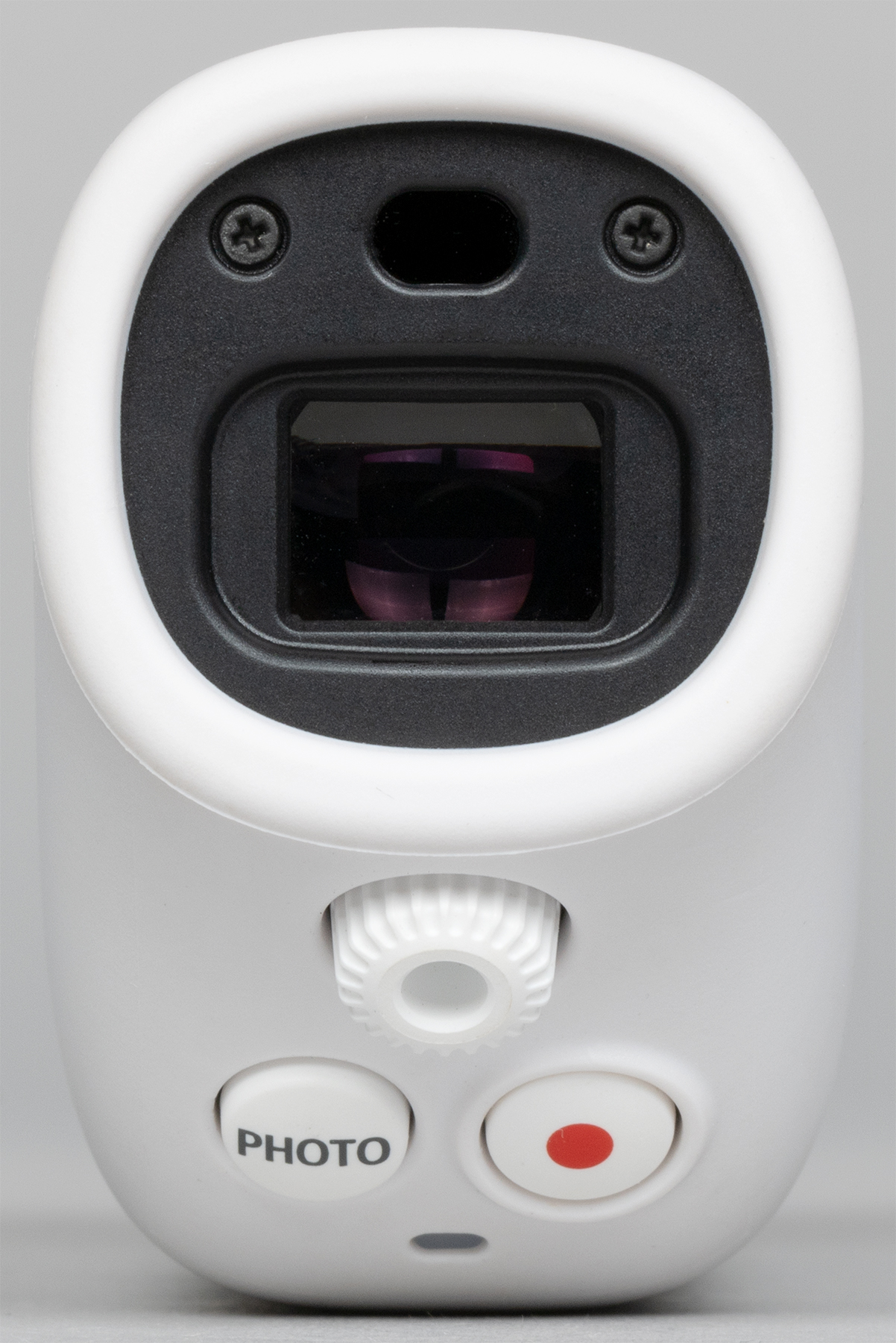 Снизу на корпусе расположены колесико диоптрийной регулировки, кнопки активации съемки фото (помечена Photo) и видео (помечена красной точкой), а также светодиодный индикатор включения питания.