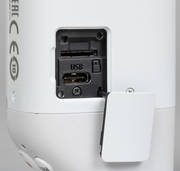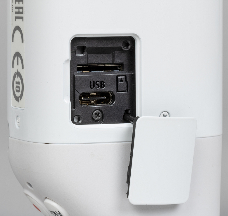 Под крышкой располагаются слот для карт памяти microSD и разъем USB Type C, с помощью которого производится зарядка встроенного аккумулятора. Производитель рекомендует использовать для этой цели фирменное зарядное устройство PD-E1 либо любой другой адаптер постоянного тока 9 В, обеспечивающий силу тока 2 А (в комплекте поставки отсутствует).