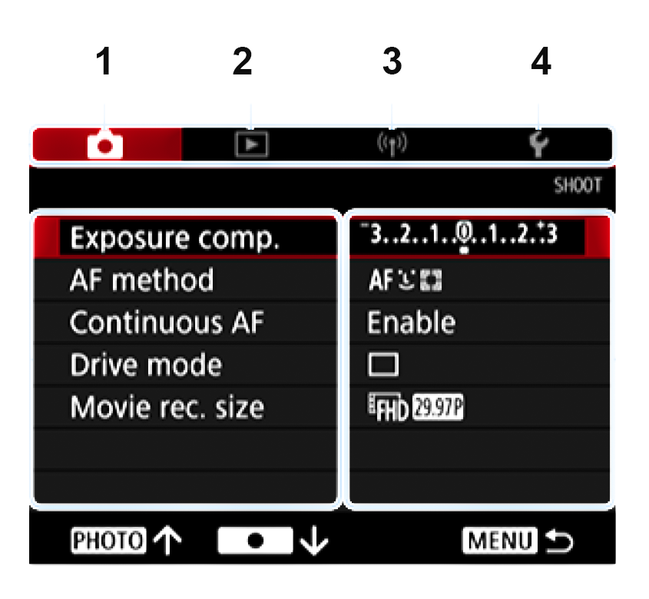Позиции меню сгруппированы в четыре раздела (вкладки): 1 — съемка; 2 — просмотр отснятого материала и работа с картой памяти; 3 — беспроводная связь; 4 — установки. Приведем некоторые скриншоты.