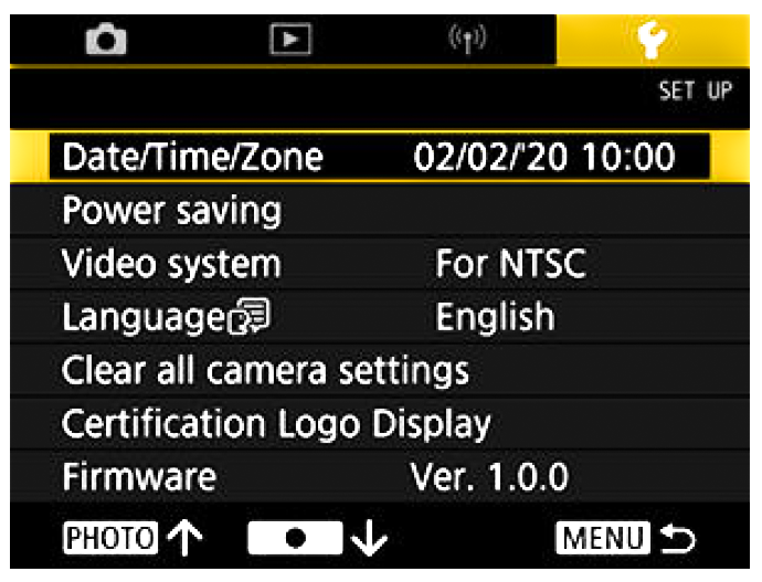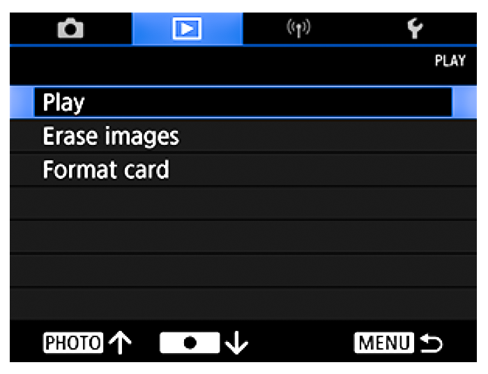 Меню вызывается нажатием кнопки с соответствующей маркировкой на верхней панели устройства. Вид и принципы организации меню соответствуют устоявшимся стандартам производителя, хотя, разумеется, количество опций сильно уменьшено по сравнению с полновесной фото- или видеокамерой.