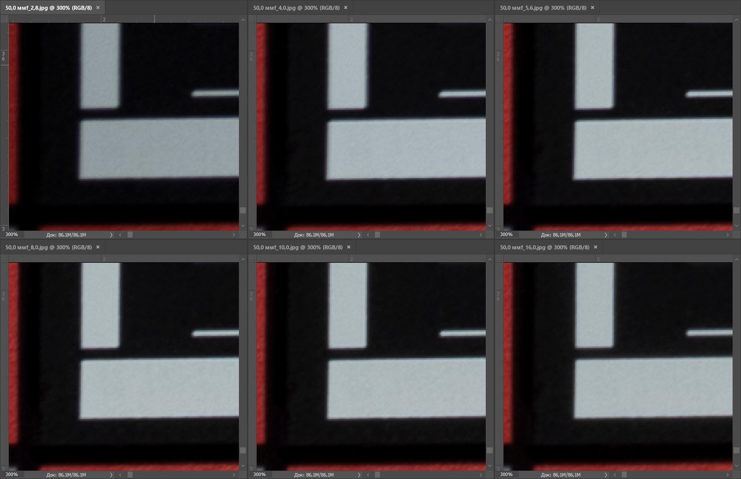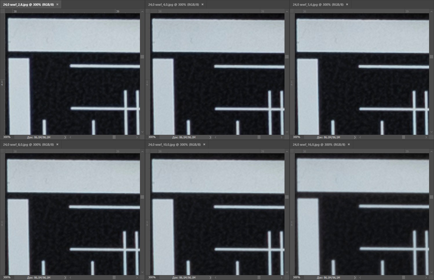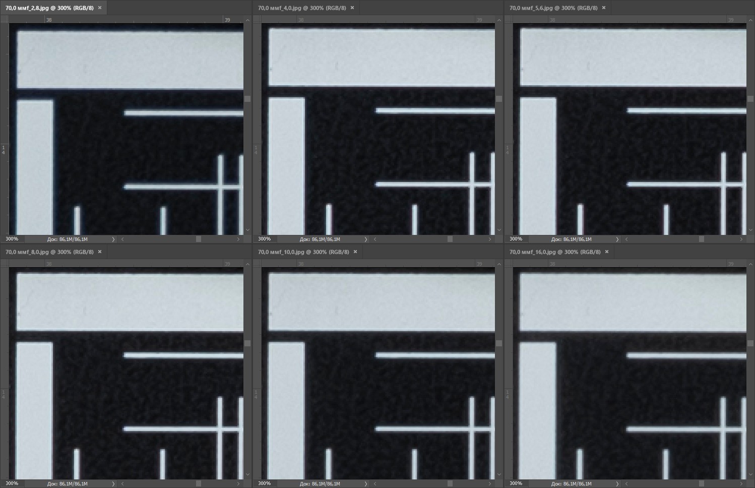 | На всех скриншотах верхний ряд: f/2,8 — f/4,0 — f/5,6, нижний ряд: f/8 — f/10 — f/16 | |||