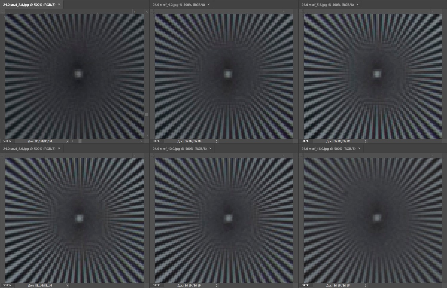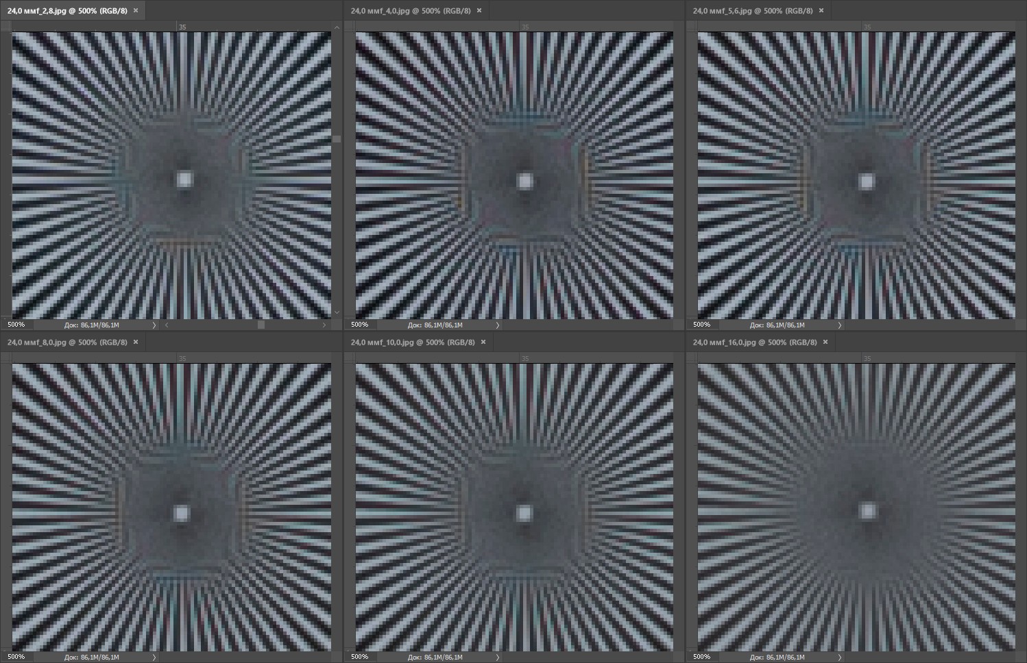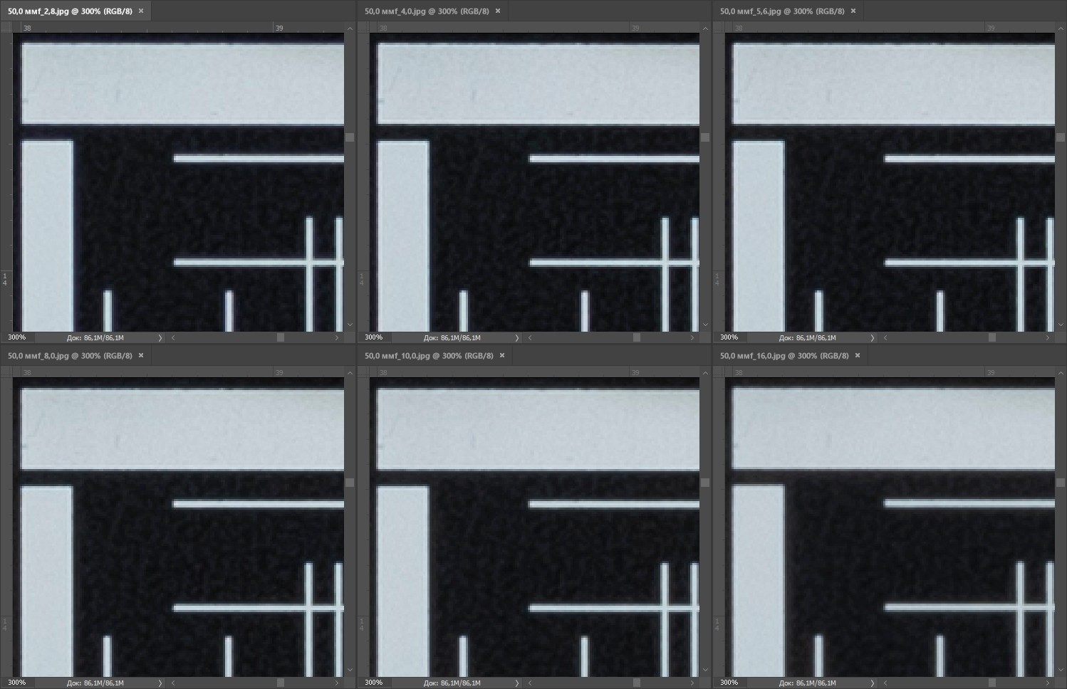 | На всех скриншотах верхний ряд: f/2,8 — f/4,0 — f/5,6, нижний ряд: f/8 — f/10 — f/16 | |||
