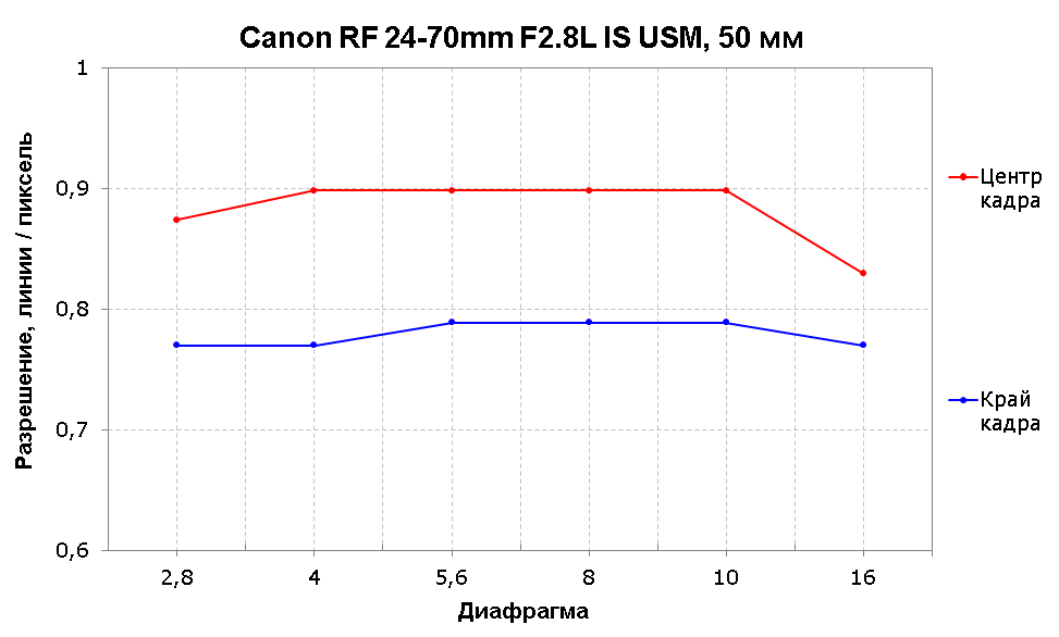 На 50 мм картина та же, лишь с небольшими изменениями. На диафрагме F2,8 центр стал чуть мягче, а край немного прибавил. В целом центр уверенно держится на отметке 0,9 линии на пиксель, а край отстает с тем же разрывом. Также интересно отметить, что эффект дифракции на закрытых диафрагмах стал менее заметным.