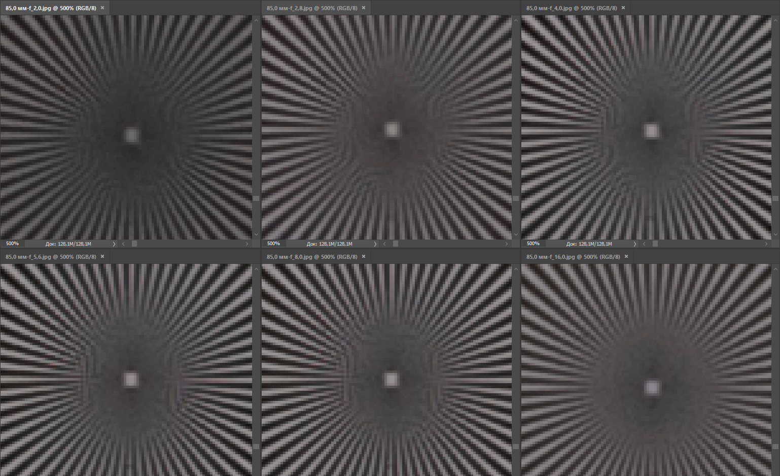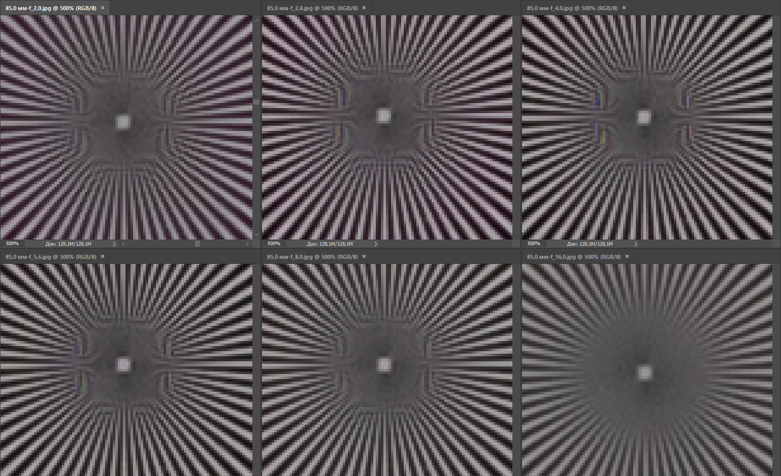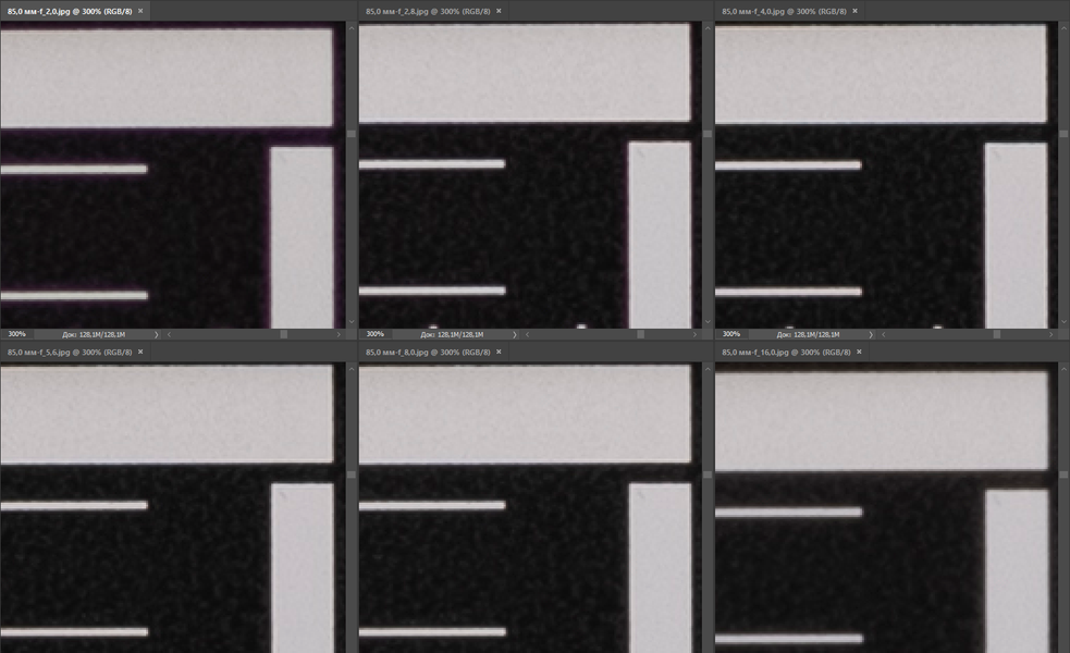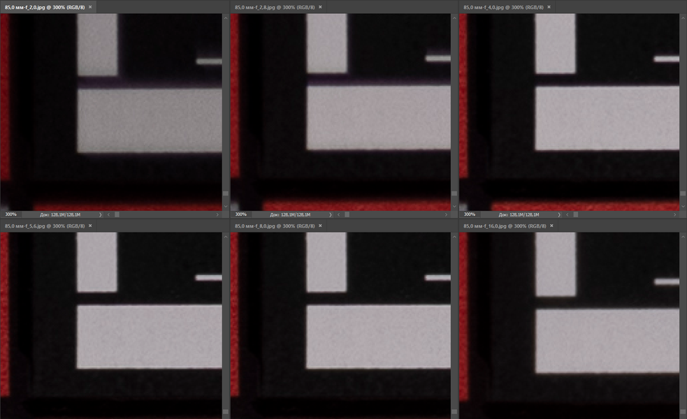 Резкость в центре кадра хороша уже на полном раскрытии. При F5,6–F13 она достигает максимума, а начиная с F16 понижается из-за влияния дифракции. Резкость на краях при F2 сильно отстает от центральной, при F4–F5,6 постепенно возрастает и приближается к резкости в центре, а при F8 достигает максимума.