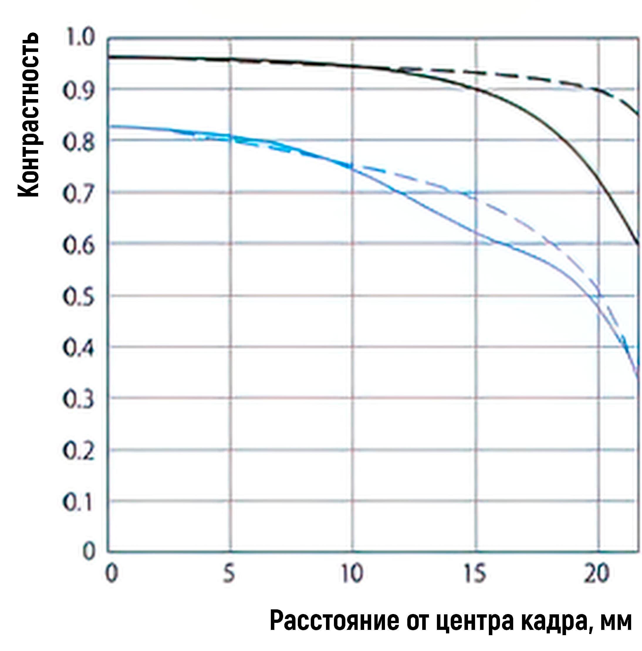 Кривые ЧКХ (Modular Transfer Function, MTF) можно найти на сайте Canon. Черным обозначены графики для 10 линий/мм, голубым — для 30 линий/мм; сплошные линии отображают сагиттальные структуры, пунктирные — меридиональные. Напомним, что в идеале все они должны располагаться максимально высоко по оси коэффициента контрастности, быть параллельными оси расстояний от центра кадра и не содержать завалов. Подробнее о том, как читать графики MTF, можно узнать на сайте Canon.