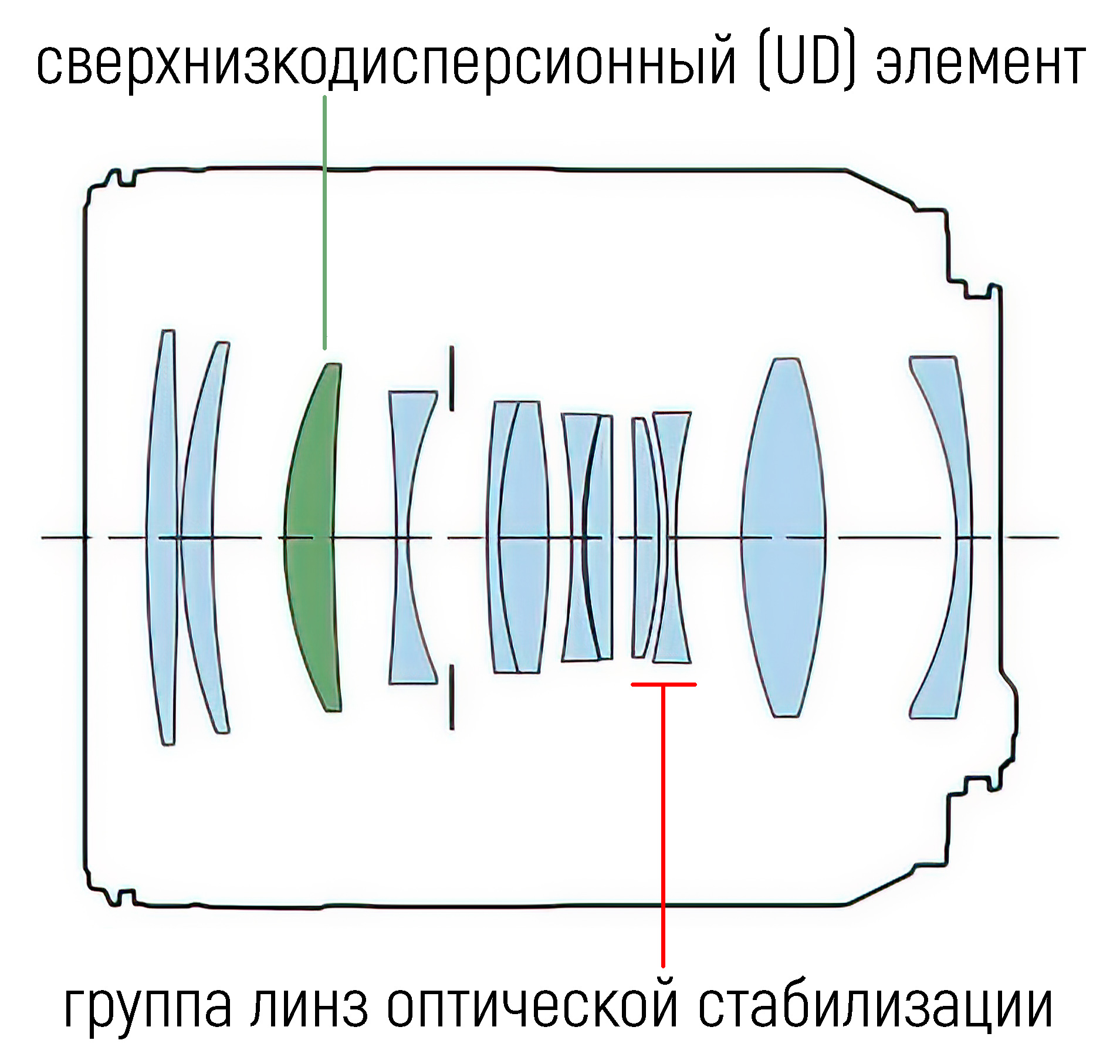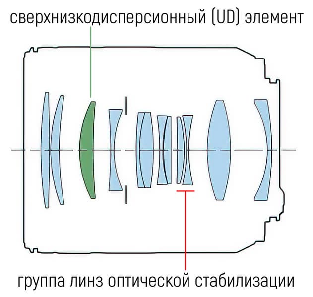 Объектив построен из 12 оптических элементов, которые объединены в 11 групп. Среди прочих выделяется сверхнизкодисперсионная линза (Ultra-low Dispersion, UD).
