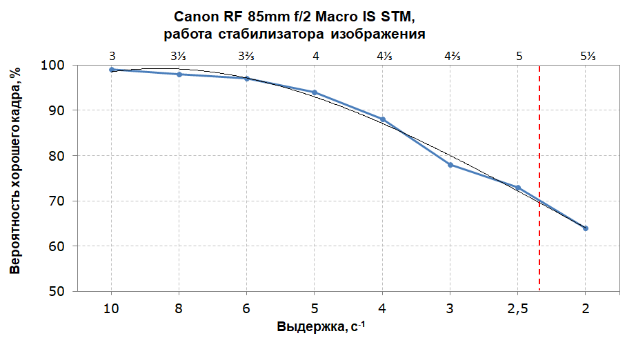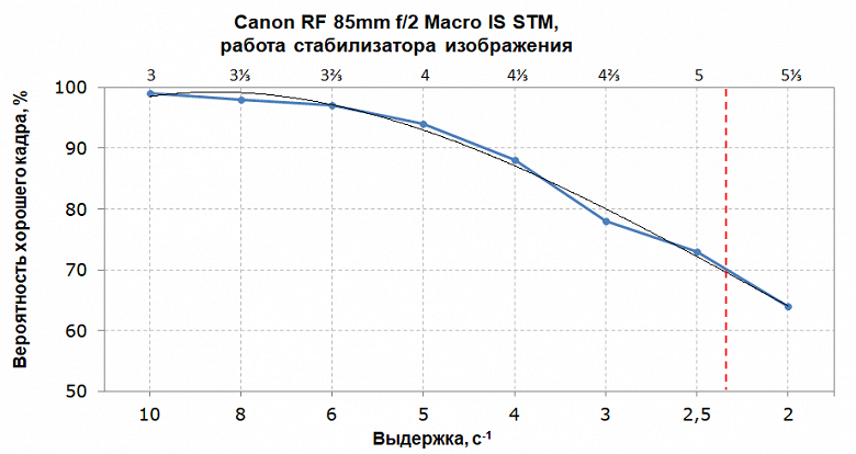 Производитель заявляет эффективность стабилизатора в 5 ступеней. Наша методика позволяет оценить эффективность стабилизатора в 5 ступеней экспозиции, что соответствует заявленному.