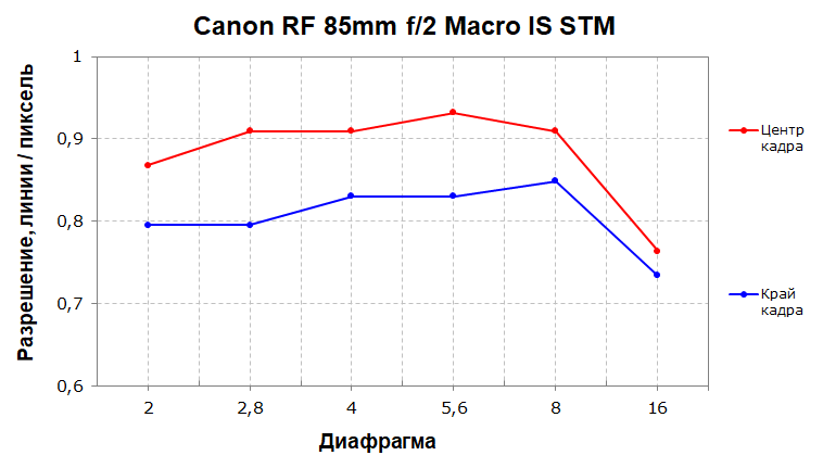 Разрешающая способность высокая и довольно стабильная — в среднем на уровне 90% в центре кадра и около 82% на краю вплоть до f/8. Разброс между краем и центром кадра не слишком существенный, но и не маленький для телеобъектива с фиксированным фокусным расстоянием. Впрочем, это компенсируется высокими значениями разрешающей способности, при которых такой разброс не критичен.