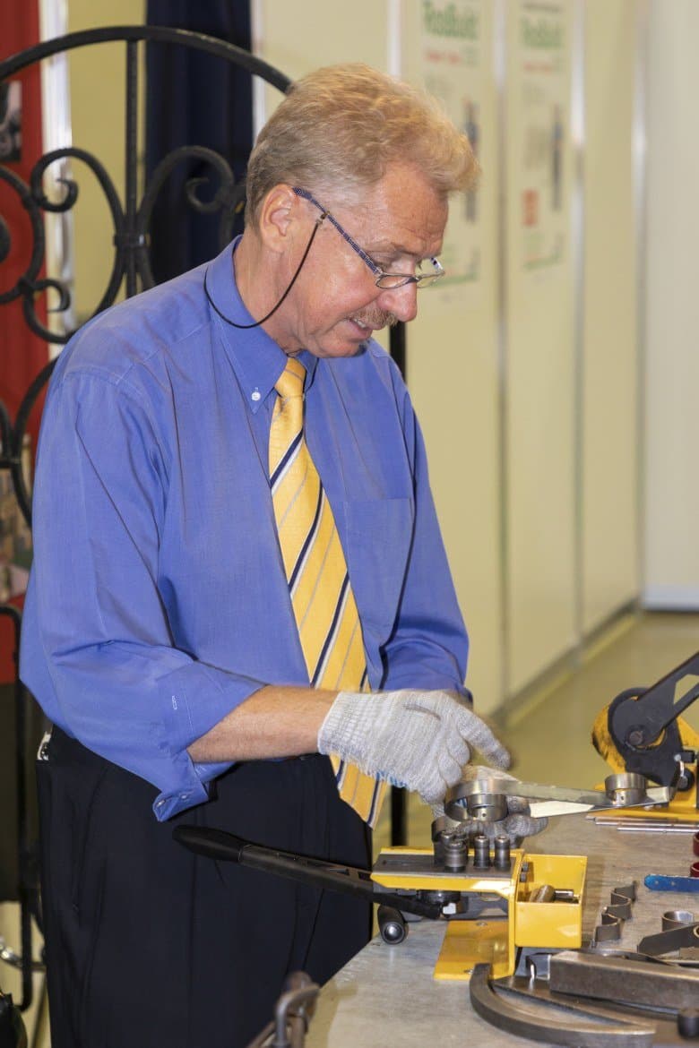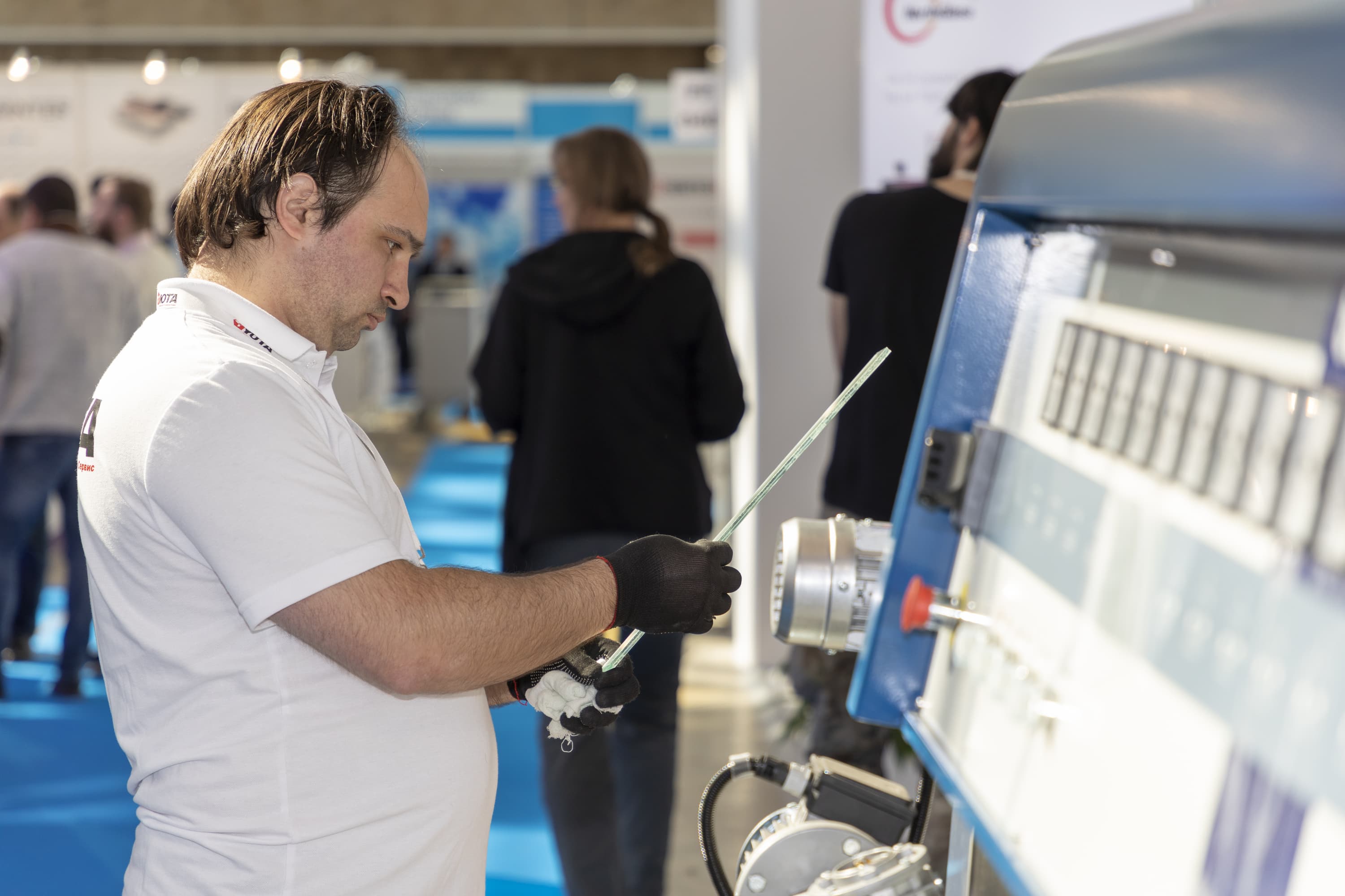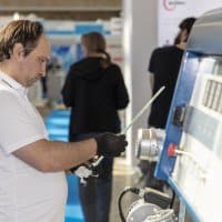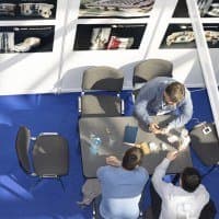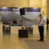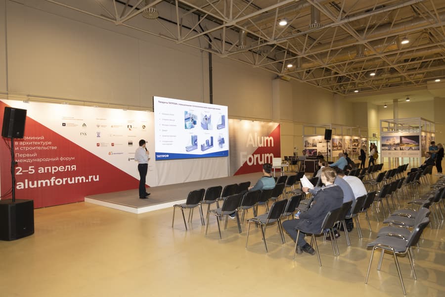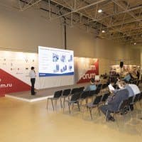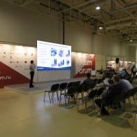 В приведенном примере охват сцены достаточно велик, поскольку зум-объектив использован в широкоугольном положении (24 мм). В подобной ситуации фигура докладчика довольно мелка, и ее трудно сделать сюжетным центром композиции. Поэтому есть смысл подчеркнуть тематику доклада (или всего мероприятия), тем более что баннеры, уведомляющие о деталях, хорошо различимы. Можно также намекнуть на то, что в зале отнюдь не аншлаг, и большинство зрительских мест пустует. Посмотрим, что даст нам использование Canon Speedlite 470EX-AI.