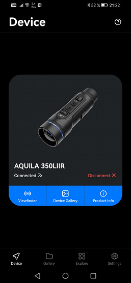 С помощью смартфона пользователь может вести наблюдение, находясь в укрытии на расстоянии от тепловизора (уверенная видеосвязь между смартфоном и тепловизором держится до 30 метров при отсутствии преград). Во время удаленного наблюдения можно запустить видеозапись или сделать снимок, данные при этом будут записаны во внутреннюю память тепловизора. Встроенная галерея файлов, записанных в память тепловизора, позволяет перенести материал в память смартфона, а видеоролики, находящиеся в памяти тепловизора, можно просмотреть здесь же, в галерее, без предварительной загрузки на смартфон (используется потоковое видео).