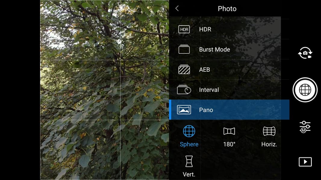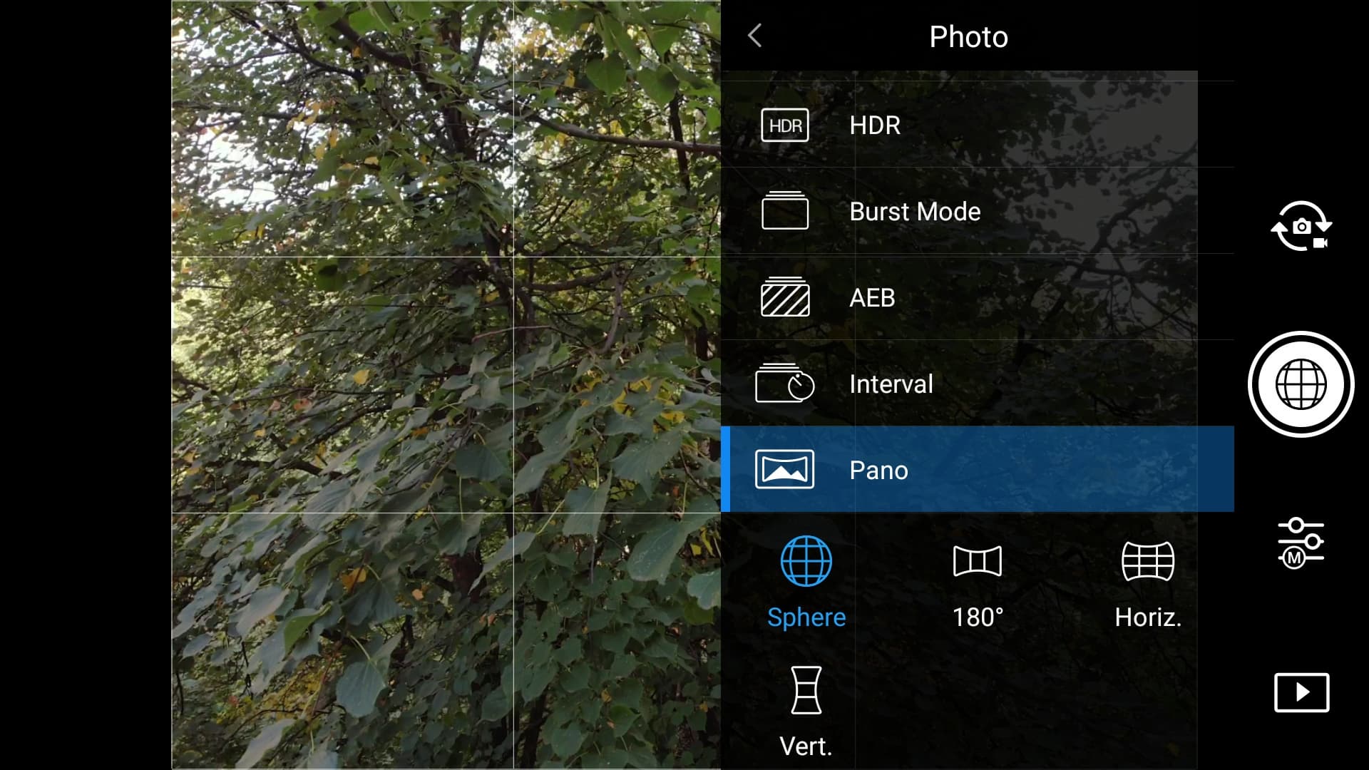 Изо всех автоматизированных функций фотосъемки меня больше всего привлекает возможность изготовления сферических панорам. При их съемке дрон поворачивается по вертикальной оси и изменяет направление оптической оси камеры при помощи подвеса. Для сферопанорамы аппарат делает 24 кадра по окружности под разным углом к горизонтальной плоскости плюс один центральный, глядя вертикально вниз.