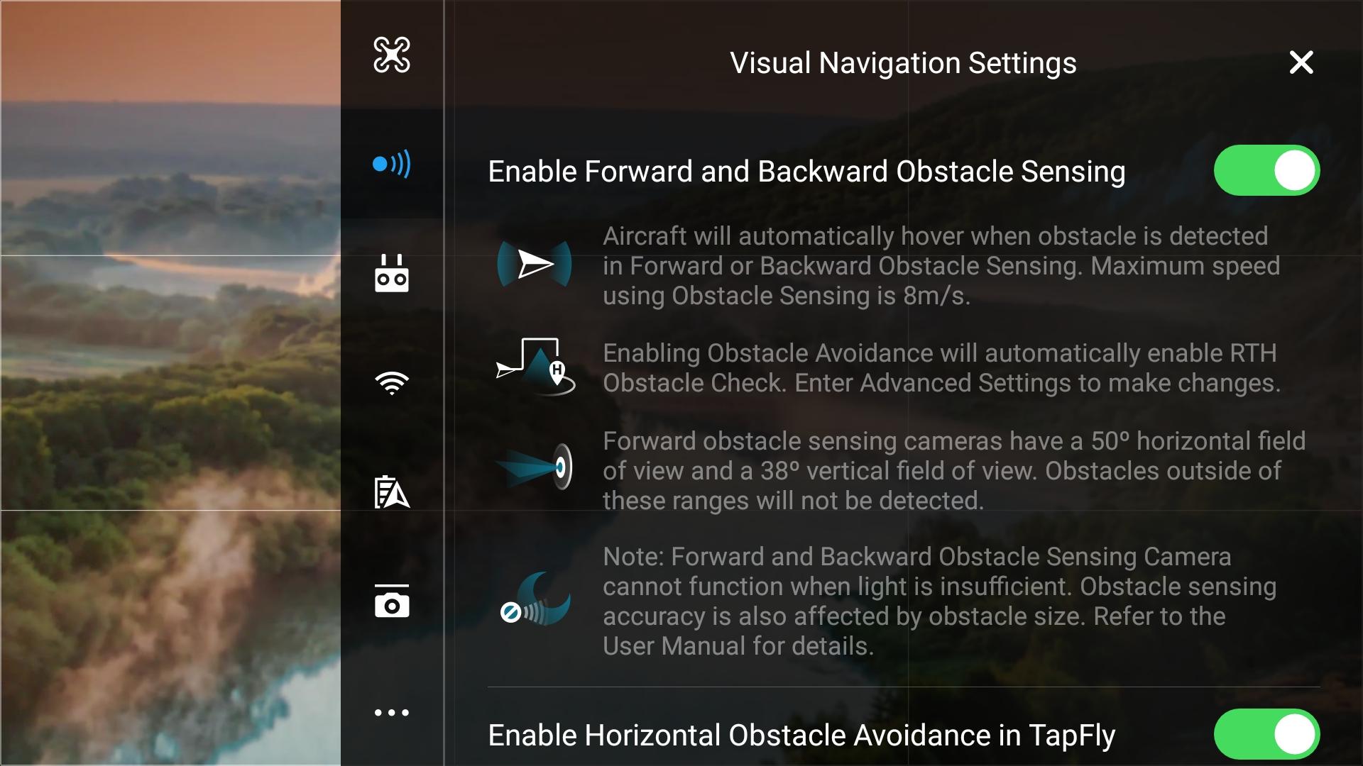 | Передние датчики | диапазон точного измерения: 0,5—12 м; общий диапазон: 0,5—24 м; скорость обнаружения препятствий: ≤8 м/с; поле обзора (FOV): 50° в горизонтальной плоскости, ±19° в вертикальной плоскости |