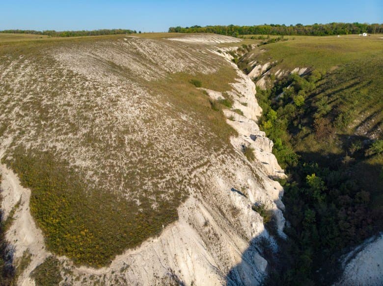 БПЛА движется по эллиптической орбите, сначала удаляясь, а затем приближаясь к объекту съемки. Урывский меловой каньон. Село Селявное. Воронежская обл. UHD 4K (3840×2160 30p).
