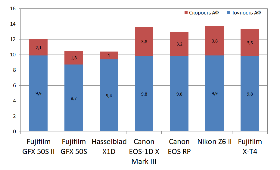 Точность автофокуса практически идеальная. А вот скоростью камера похвастаться не может. Все полнокадровые камеры обгоняют ее в 1,5-2 раза. Зато среднеформатных коллег Fujifilm GFX 50S и Hasselblad X1D-50С новая камера обгоняет довольно сильно.