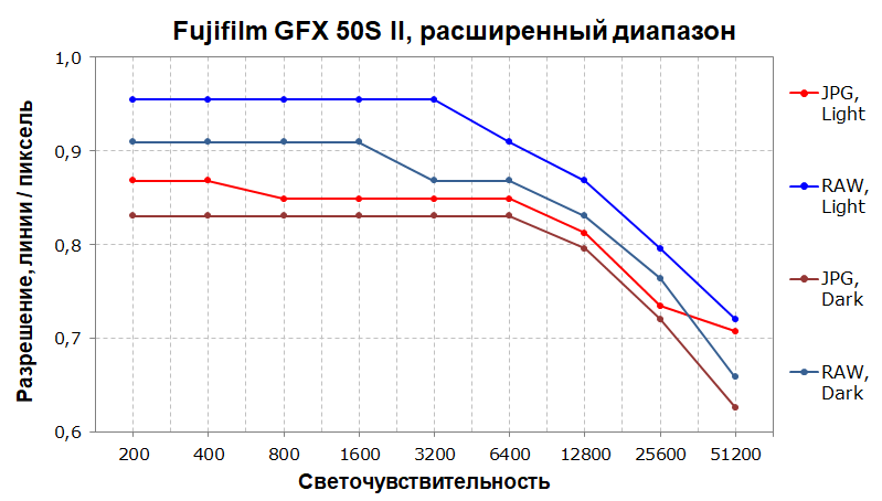 В расширенном диапазоне светочувствительности RAW и JPEG на ISO 12800 все еще выдают более 80% во всех сценах, что является хорошим результатом. В светлой сцене разрешение не падает ниже 70% даже на ISO 102400.