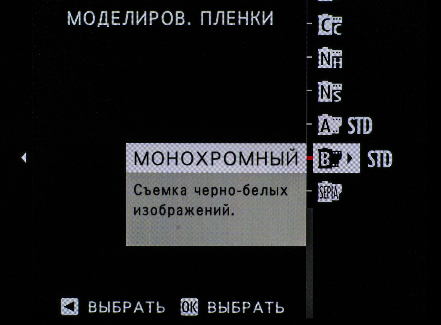 | Имитация видов пленки | 15 режимов: Provia (Standard), Velvia (Vivid), Astia (Soft), Classic Chrome, Pro Neg.Hi, Pro Neg.Std, Black&White, Black&White+Ye Filter, Black&White+R Filter, Black&White+Gfilter, Sepia, Acros, Acros+Ye Filter, Acros+R Filter, Acros+G Filter |