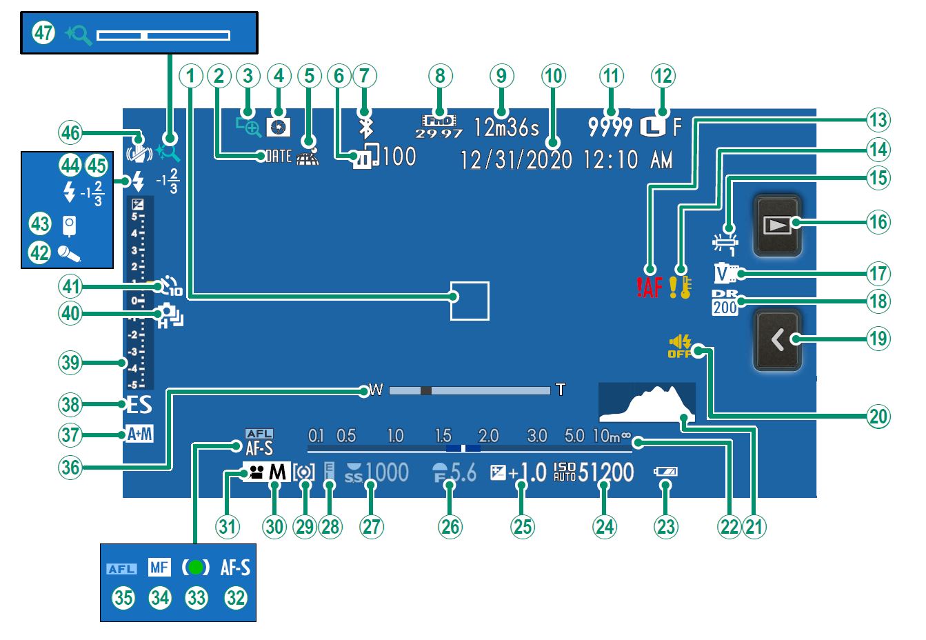 1 — фокусировочная зона; 2 — данные; 3 — контроль фокусировки; 4 — оценка глубины резкости; 5 — загрузка данных GPS; 6 — передача изображения; 7 — Bluetooth вкл./выкл.; 8 — режим видео; 9 — оставшееся время записи; 10 — текущие дата и время; 11 — оставшееся число кадров; 12 — размер и качество изображения; 13 — предупреждение о сложности фокусировки; 14 — предупреждение о нагреве камеры; 15 — баланс белого; 16 — «кнопка» просмотра отснятого материала; 17 — эмуляция видов пленки; 18 — динамический диапазон; 19 — «кнопка» вызова меню; 20 — звук и вспышка; 21 — гистограмма; 22 — шкала дистанции; 23 — заряд батареи; 24 — светочувствительность (ISO); 25 — экспокомпенсация; 26 — значение диафрагмы; 27 — значение выдержки; 28 — экспопамять (блокировка экспозиции); 29 — режим экспозамера; 30 — режим съемки; 31 — режим видео; 32 — режим АФ; 33 — индикатор успешной АФ; 34 — индикатор ручной фокусировки; 35 — блокировка фокусировки; 36 — индикатор трансфокации; 37 — индикатор автоматической/ручной фокусировки; 38 — тип затвора (механический/электронный); 39 — индикатор экспозиции (недодержка/нормальная/передержка); 40 — режим съемки серией; 41 — таймер автоспуска; 42 — подключен микрофон; 43 — подключен пульт ДУ; 44 — режим работы вспышки; 45 — компенсация мощности вспышки; 46 — режим стабилизации изображения; 47 — тач-зум (трансфокация прикосновением к экрану).
