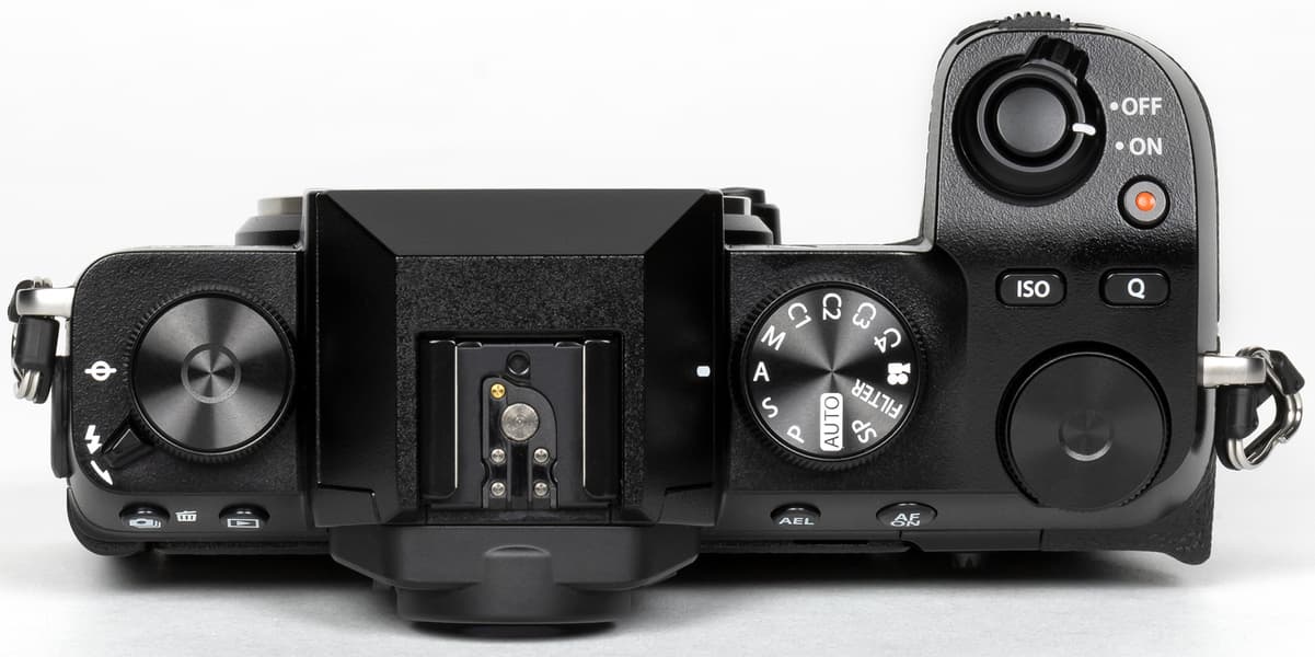 Сверху помимо уже отмеченных особенностей конструкции можно увидеть рычаг принудительного выбрасывания встроенной вспышки, полнофункциональный «горячий башмак», кнопки активации видеозаписи, выбора значения эквивалентной светочувствительности (ISO) и вызовы «быстрого меню» (Q).