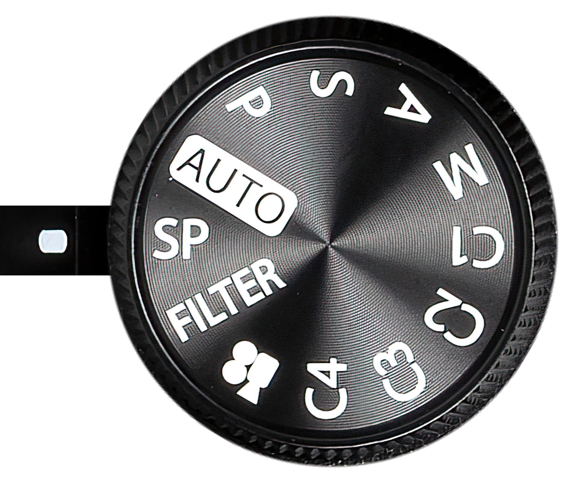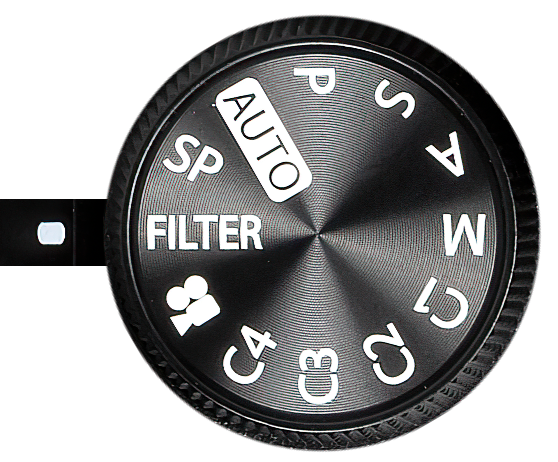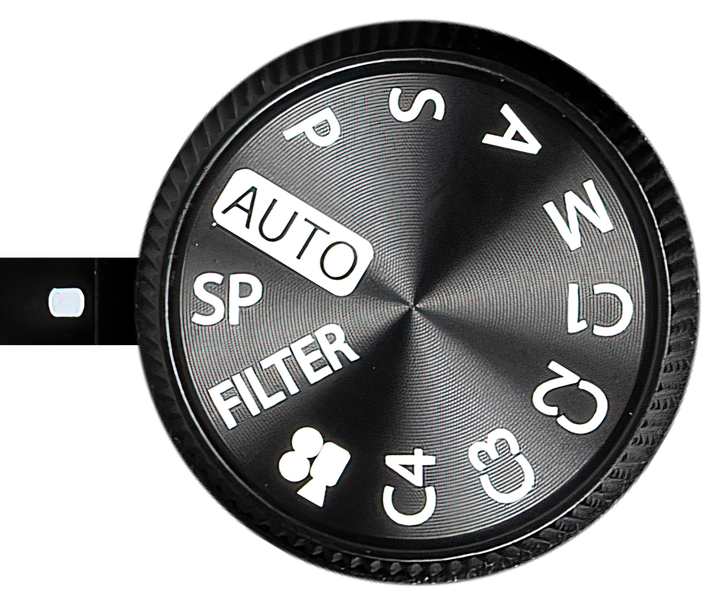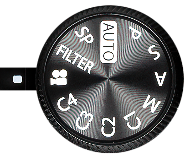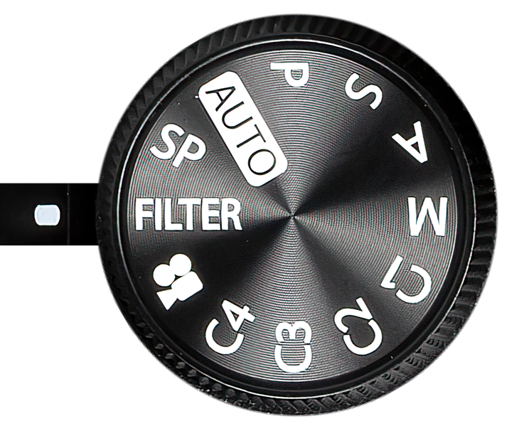 Выбор съемочного режима производится колесом главного селектора. На нем имеются традиционные положения Auto (автомат), P (программный), S (приоритет выдержки), A (приоритет диафрагмы), M (ручной), а также 4 режима пользовательских настроек, режимы видеосъемки, художественных фильтров (Filter) и съемочных программ (SP).