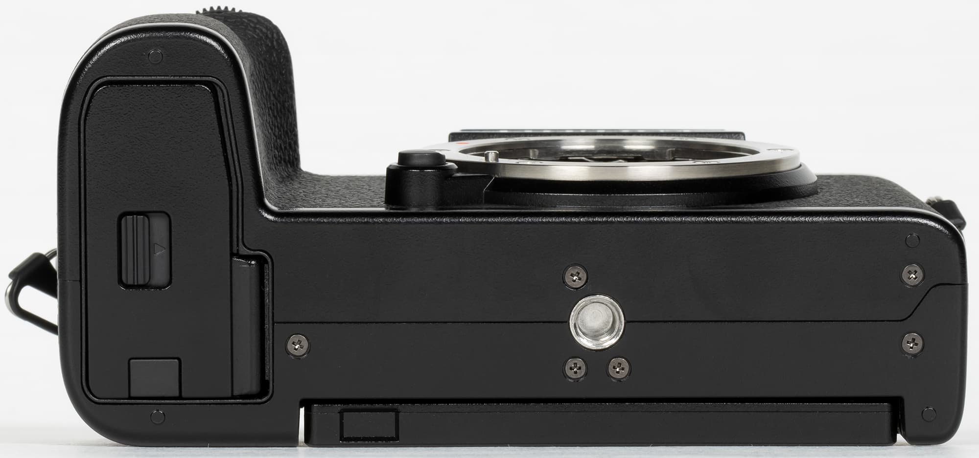 Снизу расположены крышка батарейного отсека с замком и стандартная резьба для установки на штативе.