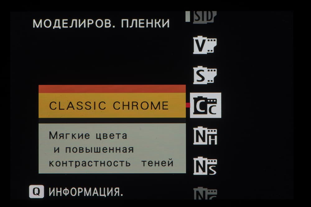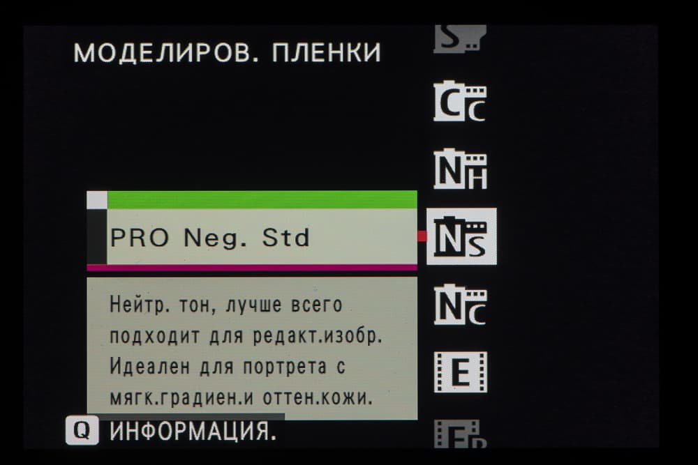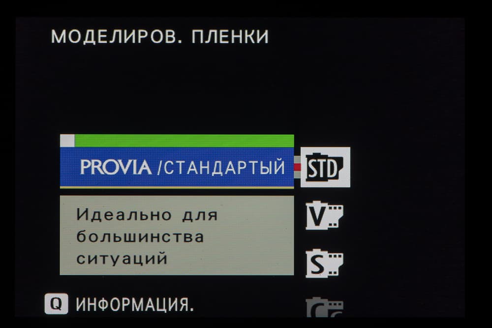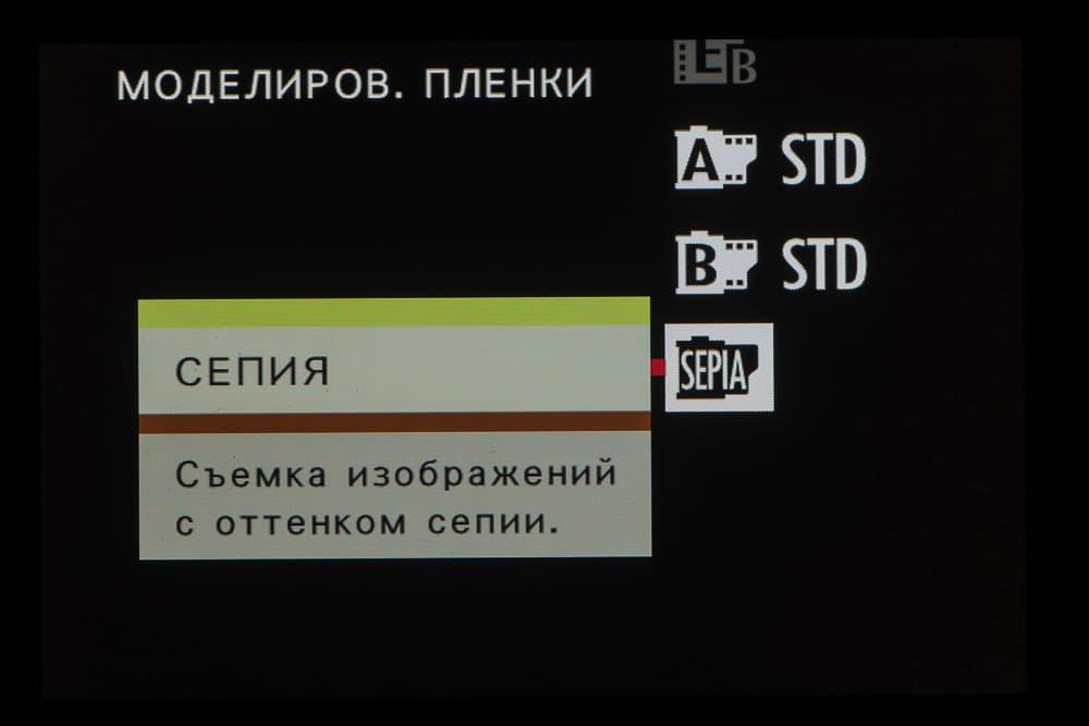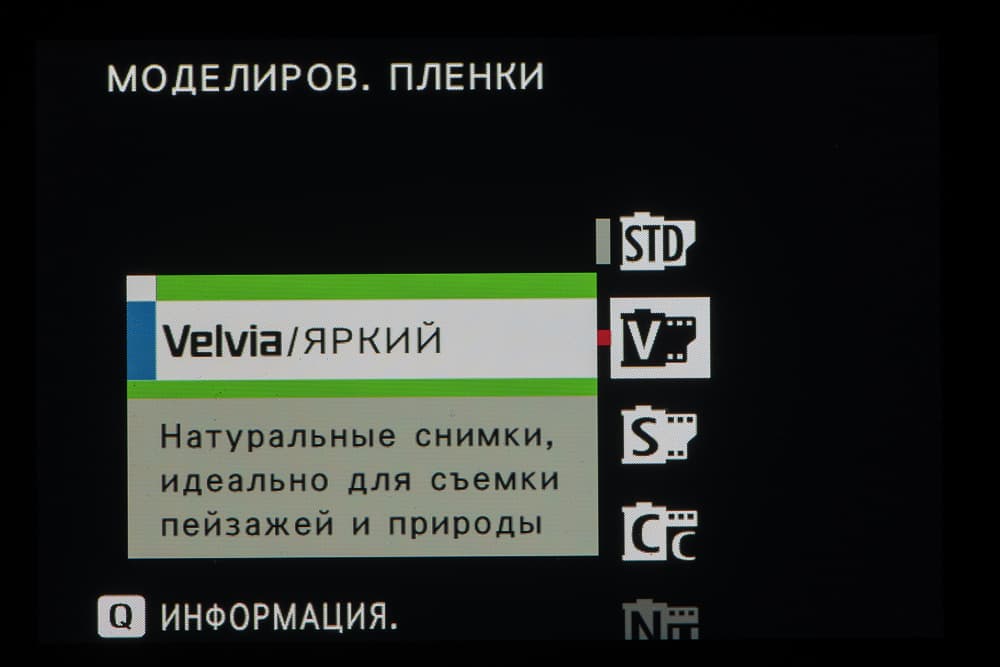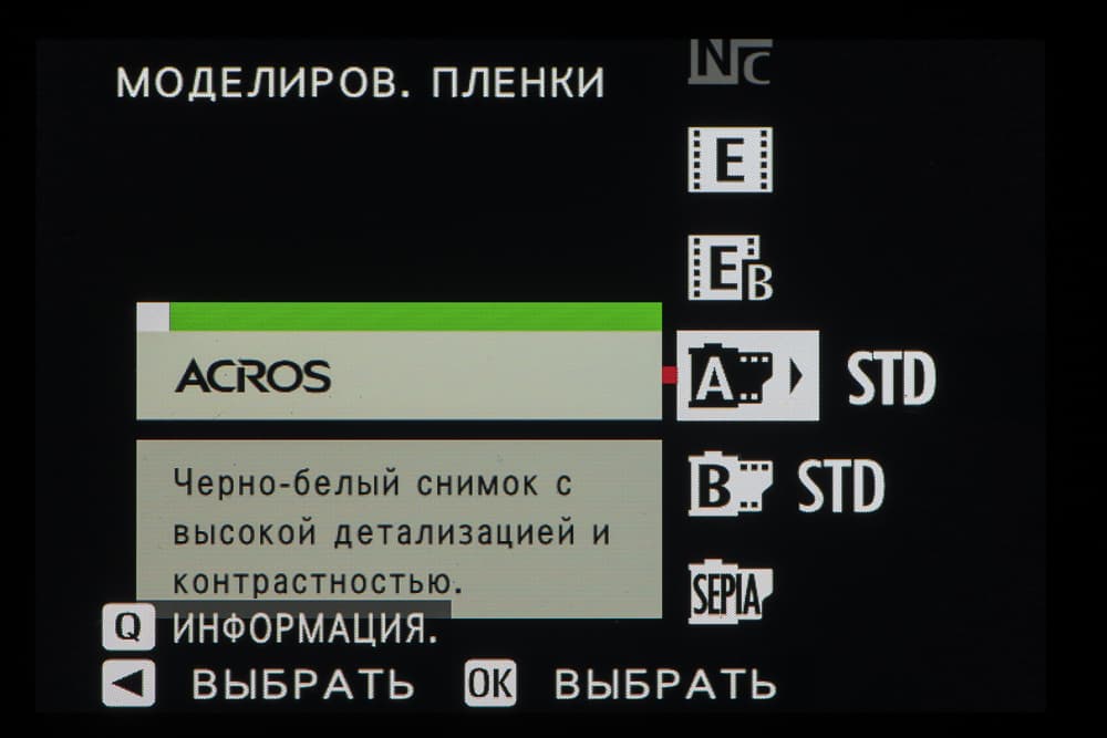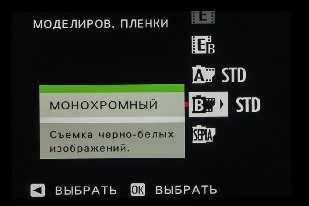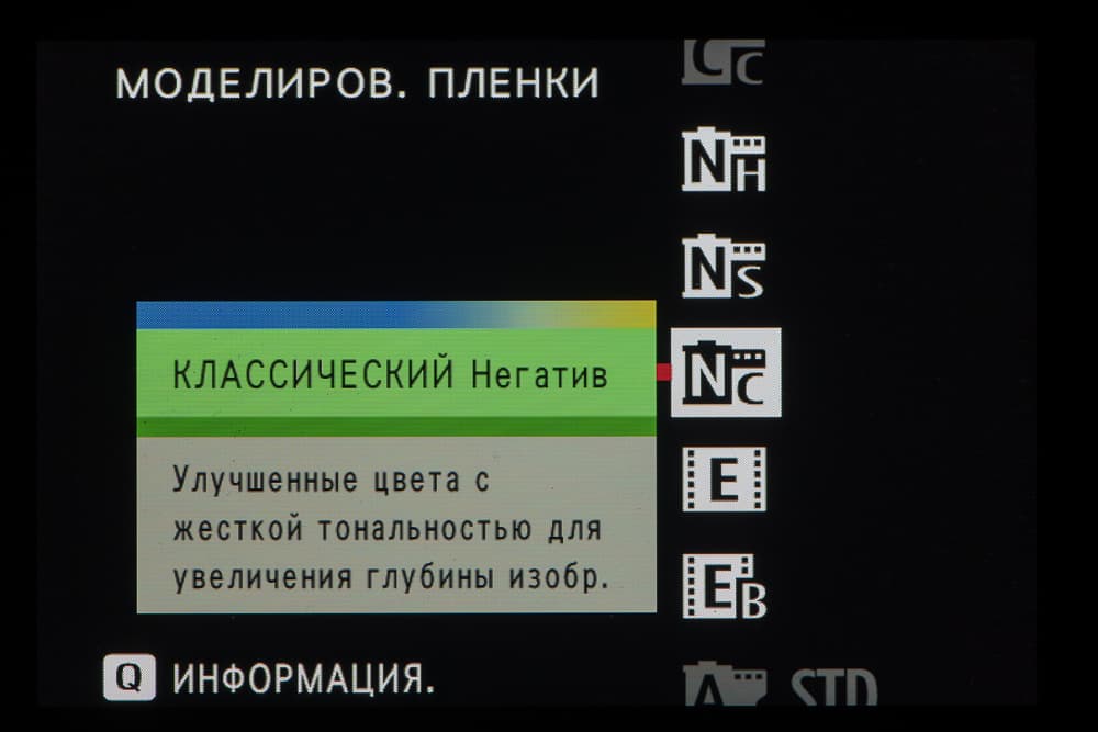 Выбор пленки желаемого типа доступен из быстрого меню. Листание производится колесом левого селектора. Эффекты постобработки применяются, естественно, только к JPEG, параллельно можно сохранить файл в формате RAW.