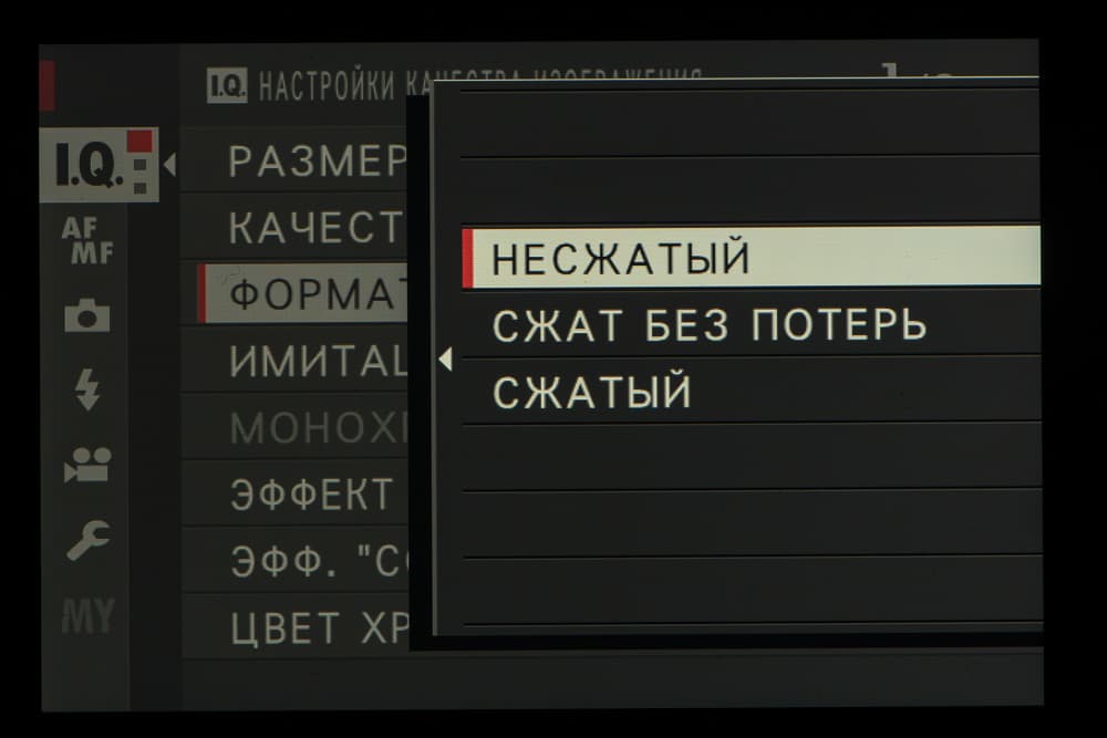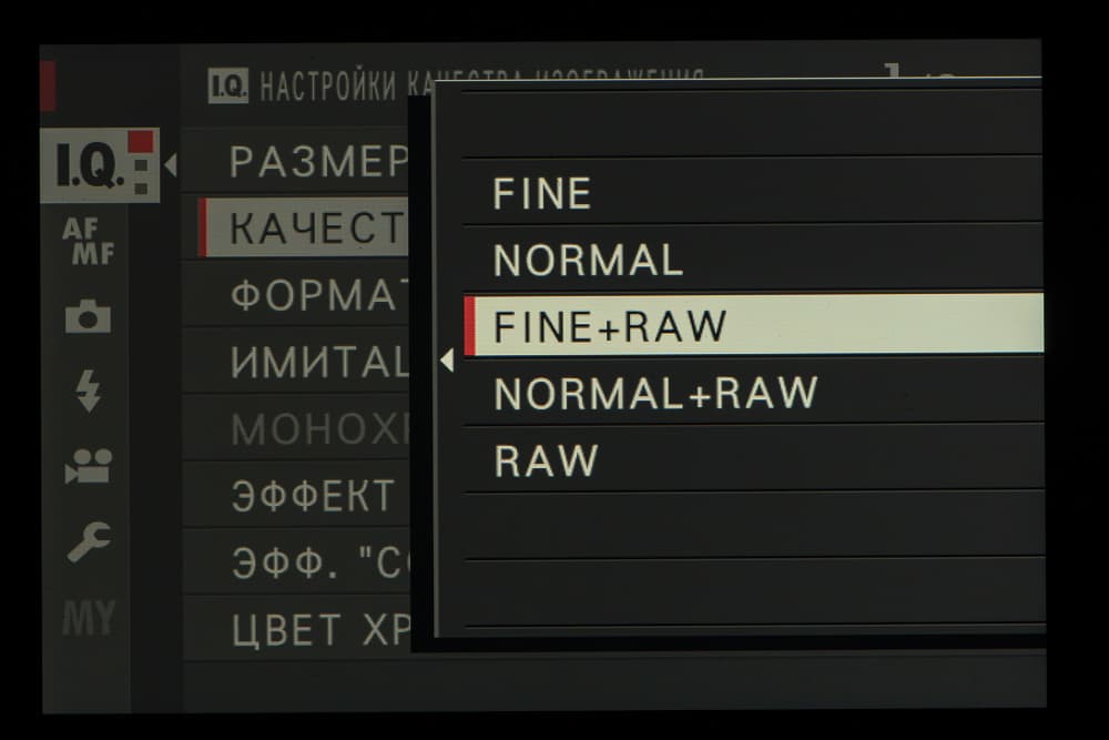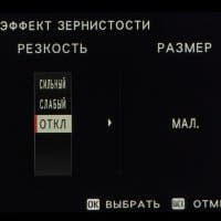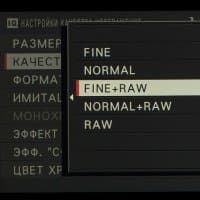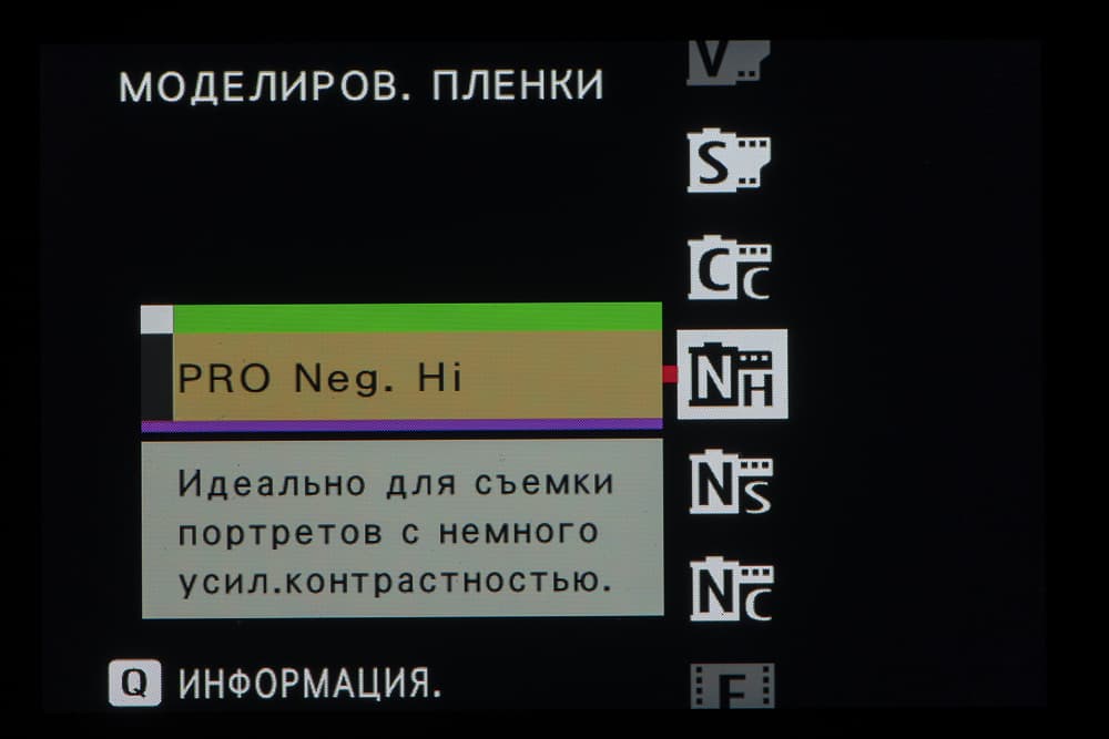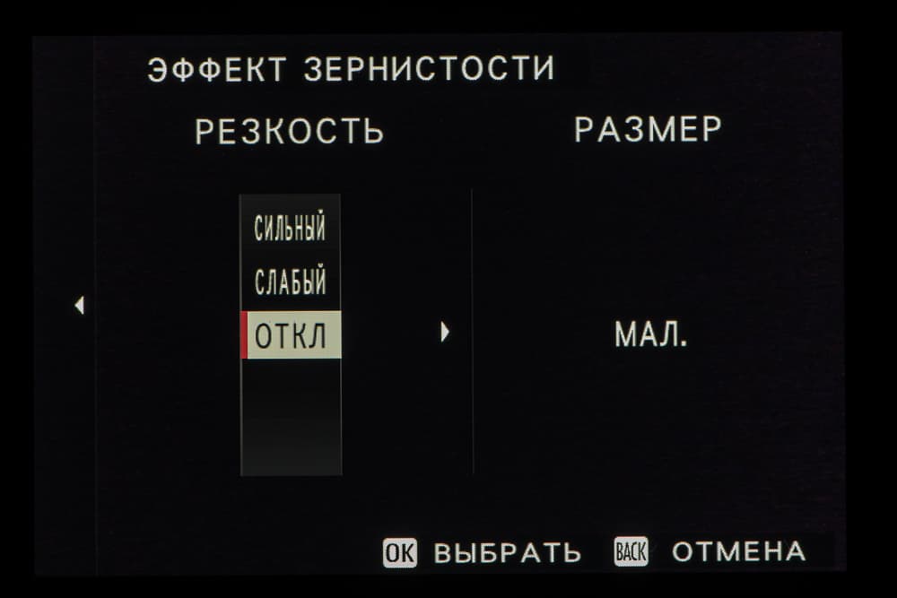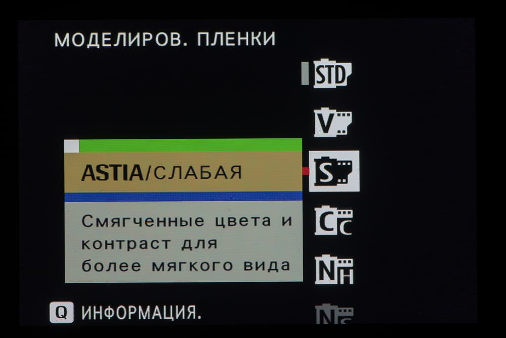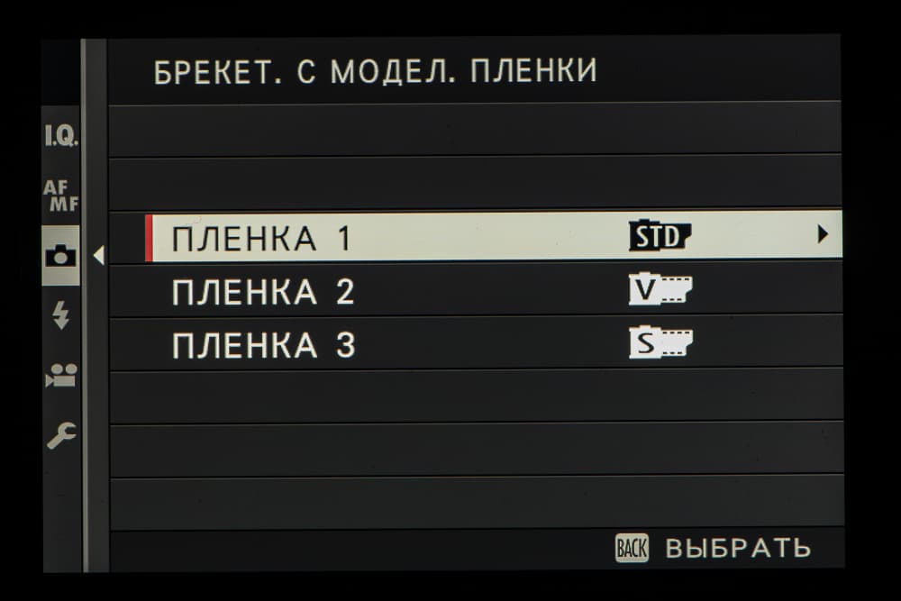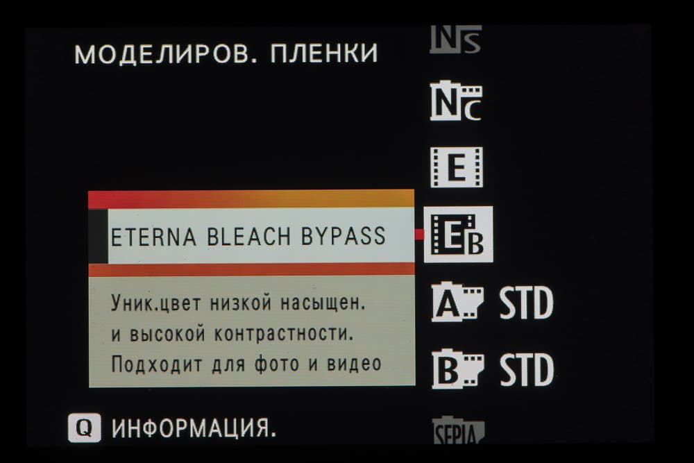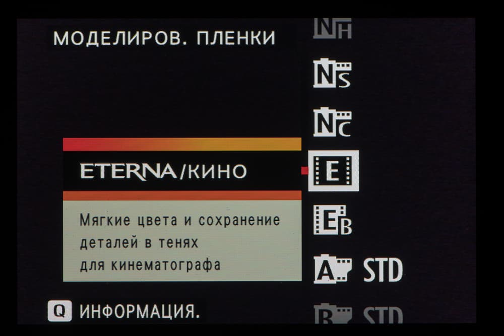 Выбор пленки желаемого типа доступен из быстрого меню. Листание производится колесом левого селектора. Эффекты постобработки применяются, естественно, только к JPEG, параллельно можно сохранить файл в формате RAW.
